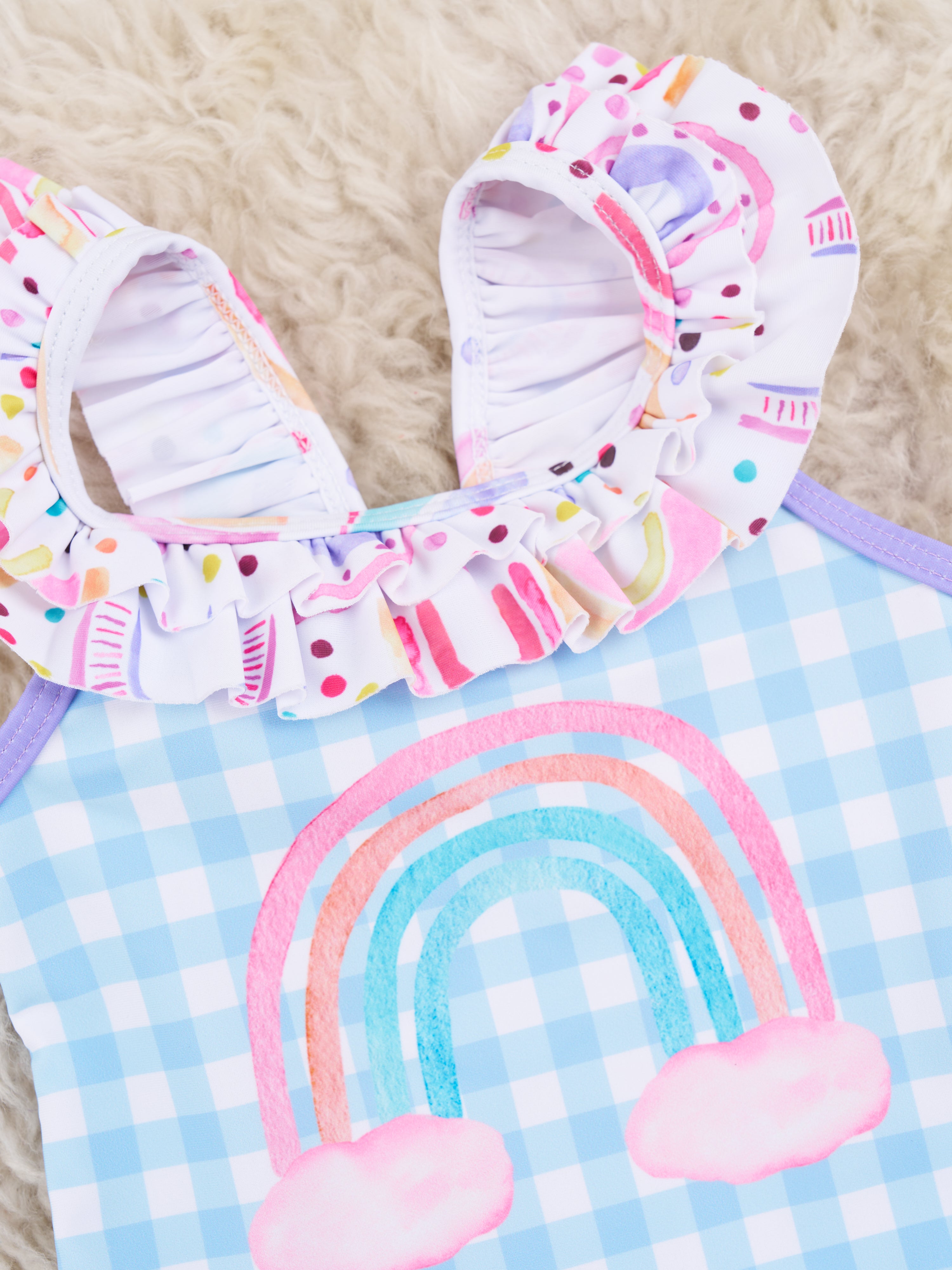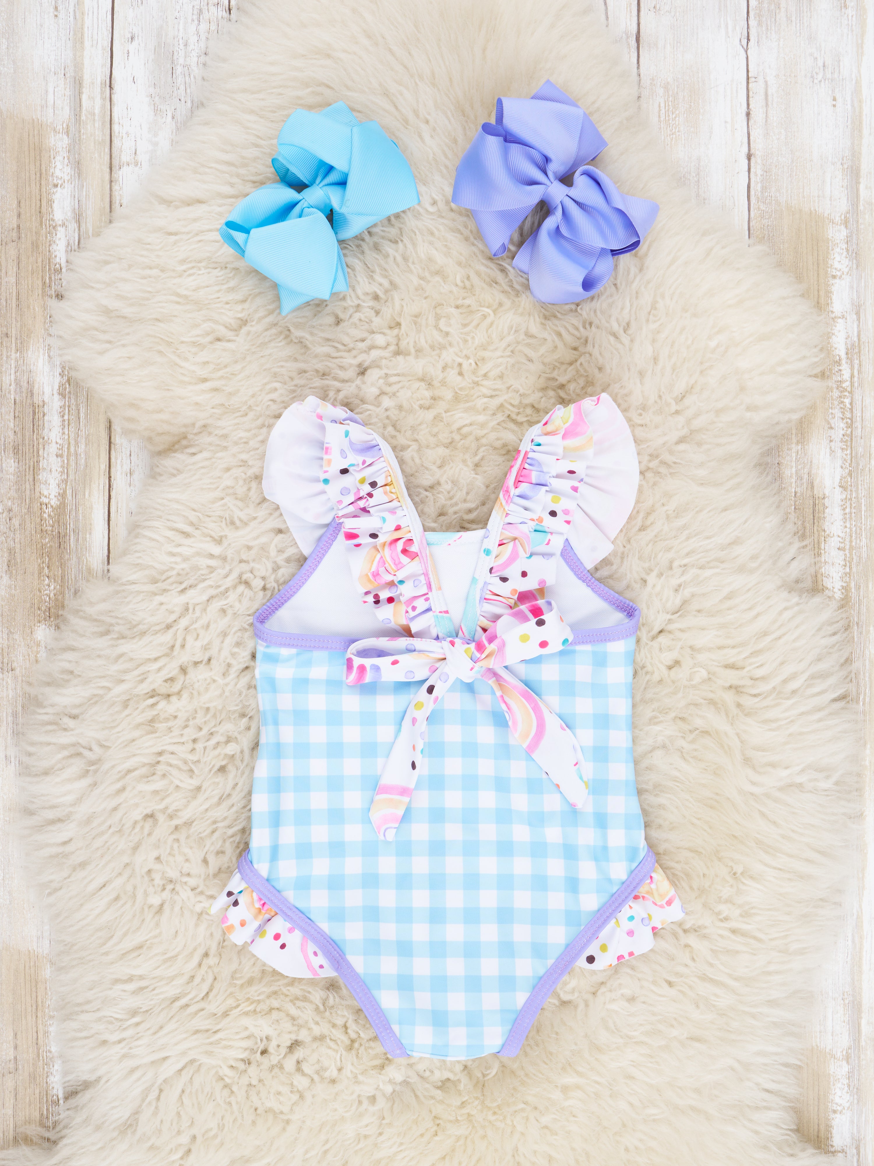 This sweet swim suit is the gold at the end of the rainbow! This one-piece swimsuit features blue gingham, purple trim, a darling rainbow detail, a tie detail on the back, & rainbow pattern ruffles.