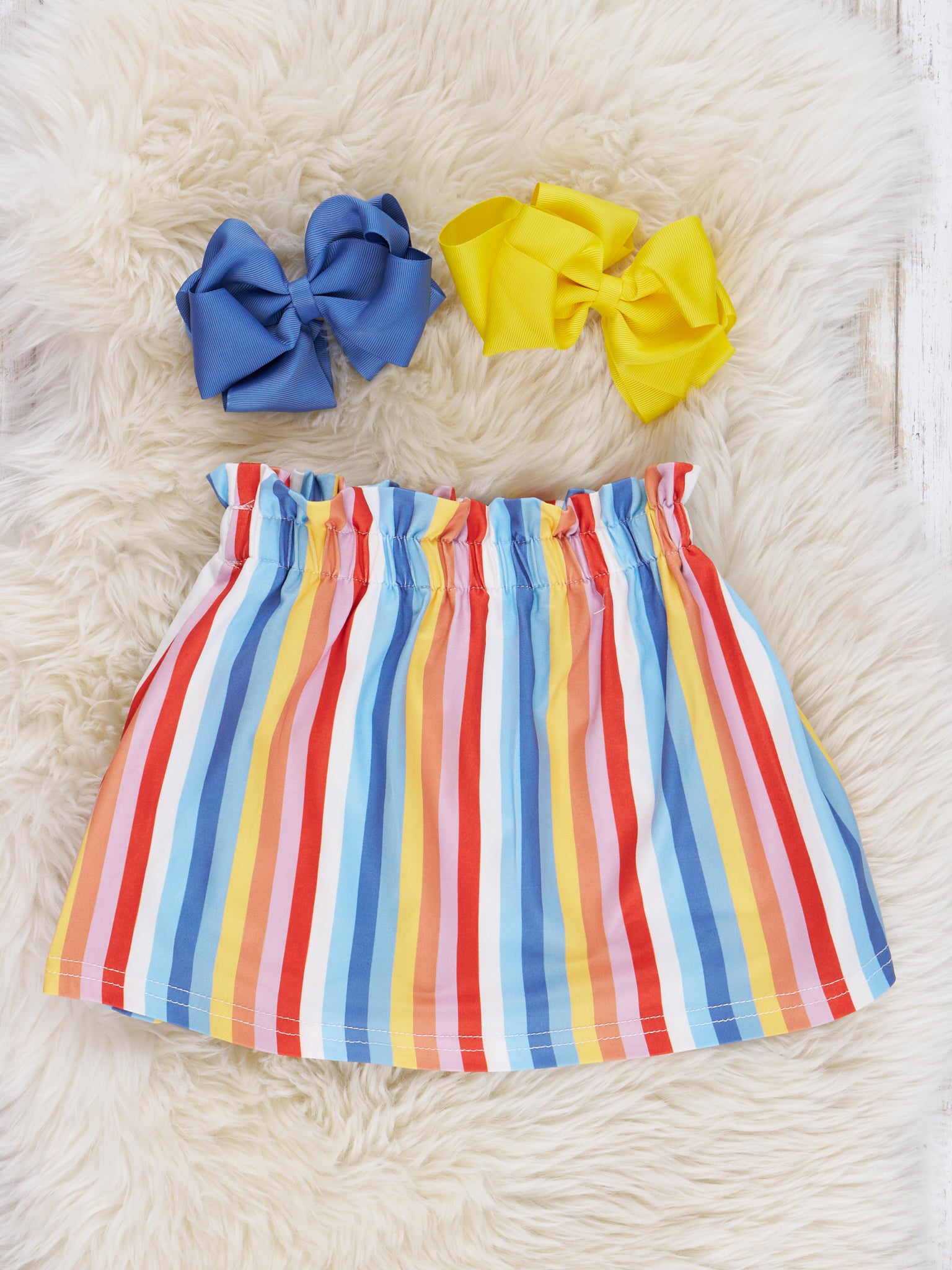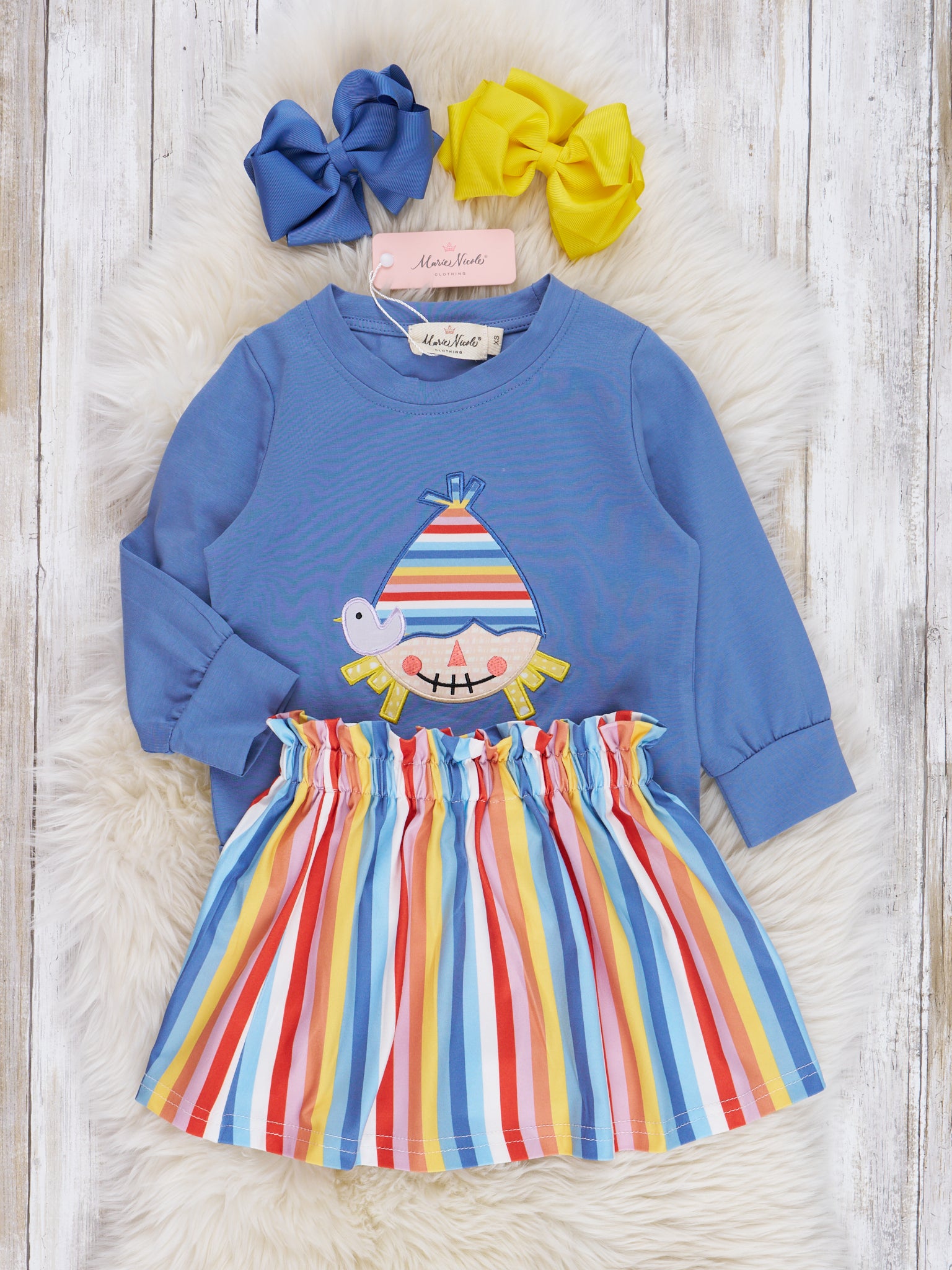Your little one will be dancing in rainbows and sunshine in our Chambray Rainbow Scarecrow sibling set! This crewneck top is a gorgeous chambray color, and the striped skirt adds a splash of color. It's all topped off with an embroidered scarecrow, perfect for playtime! A real show-stopper! đ€©