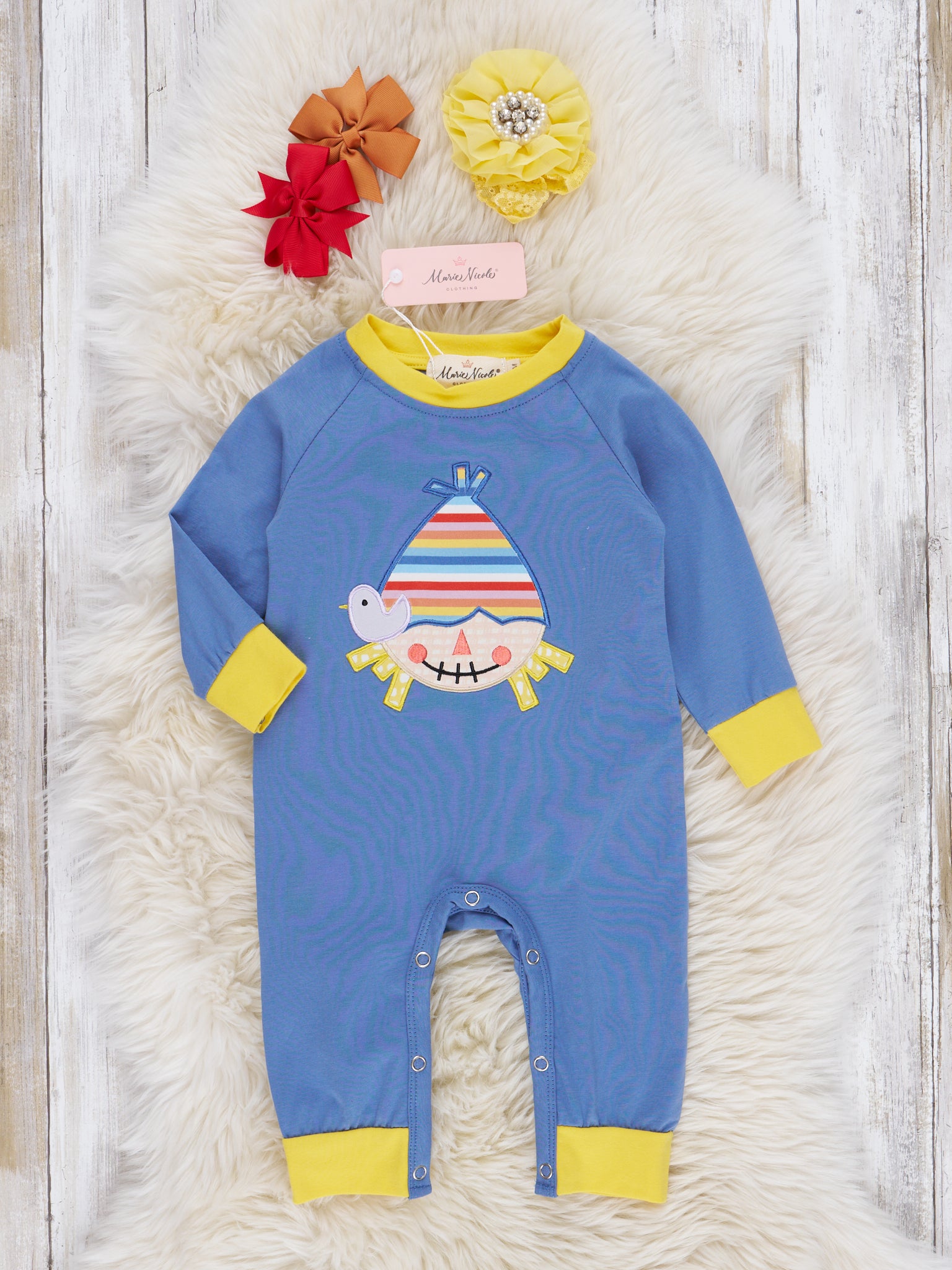 Your little one will be dancing in rainbows and sunshine in our Chambray Rainbow Scarecrow sibling set! This romper is a gorgeous chambray color, and the yellow trim accents add a splash of color. It's all topped off with an embroidered scarecrow, perfect for playtime! A real show-stopper! 🤩