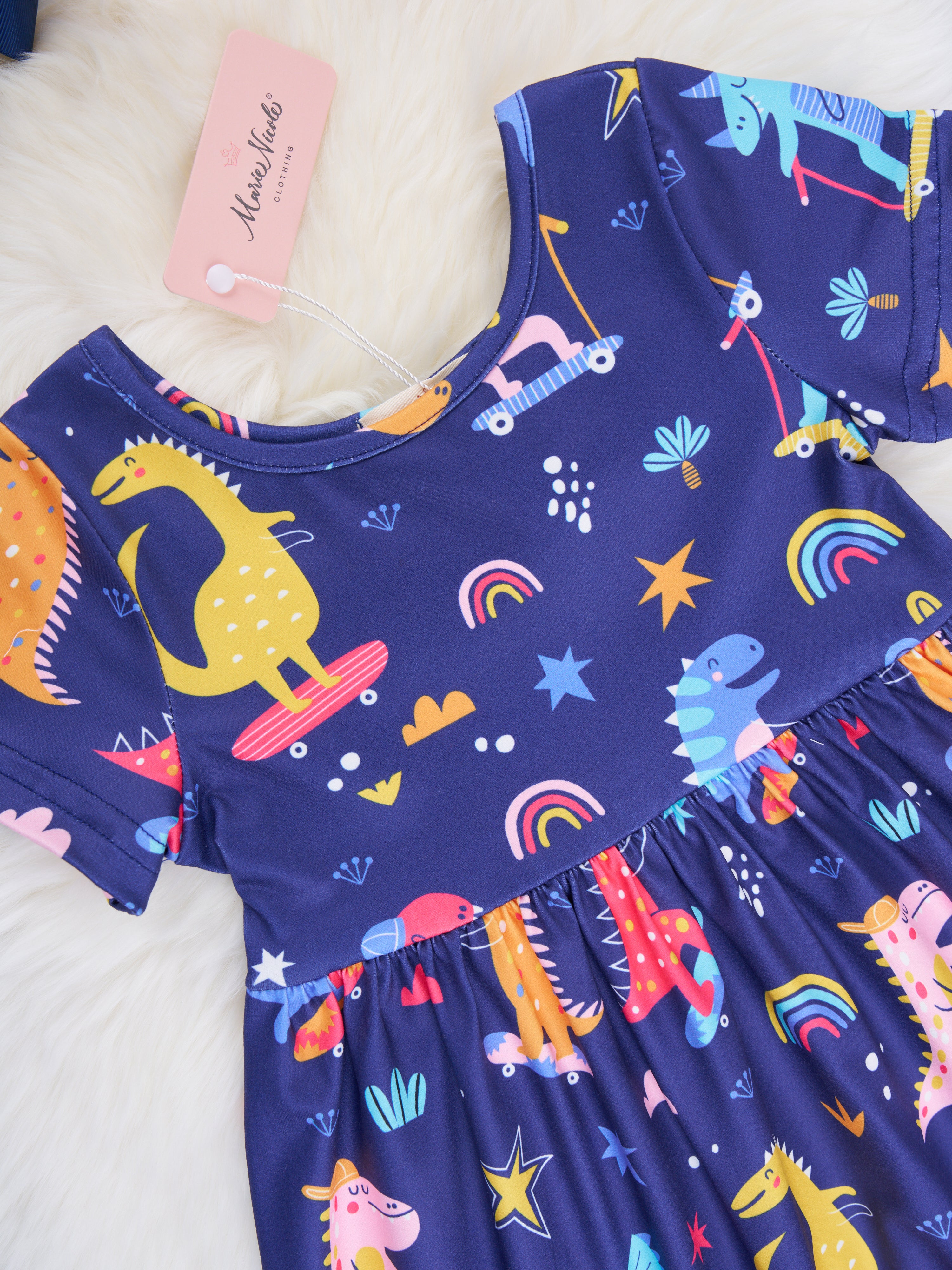 Make your kid the star of the show with this stylish Dinosaurs & Rainbows dress! Crafted from cozy navy material that'll keep 'em comfy all day, this classic dress will dazzle with its unique dinosaur & rainbow print. So why not let your kid unleash their inner dino-dazzler?!