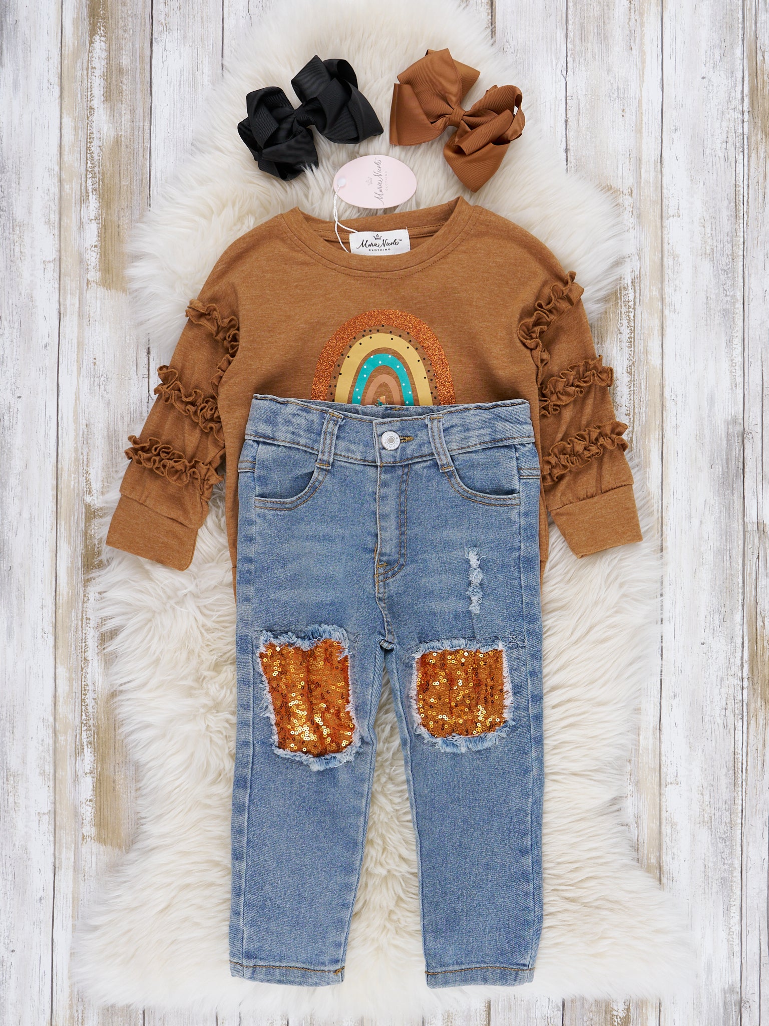 Fall For Jesus, He Never Leaves! This outfit features a brown top with ruffle details on the sleeves, a rainbow detail, & distressed denim with sequin patches and a matching ribbon belt.
