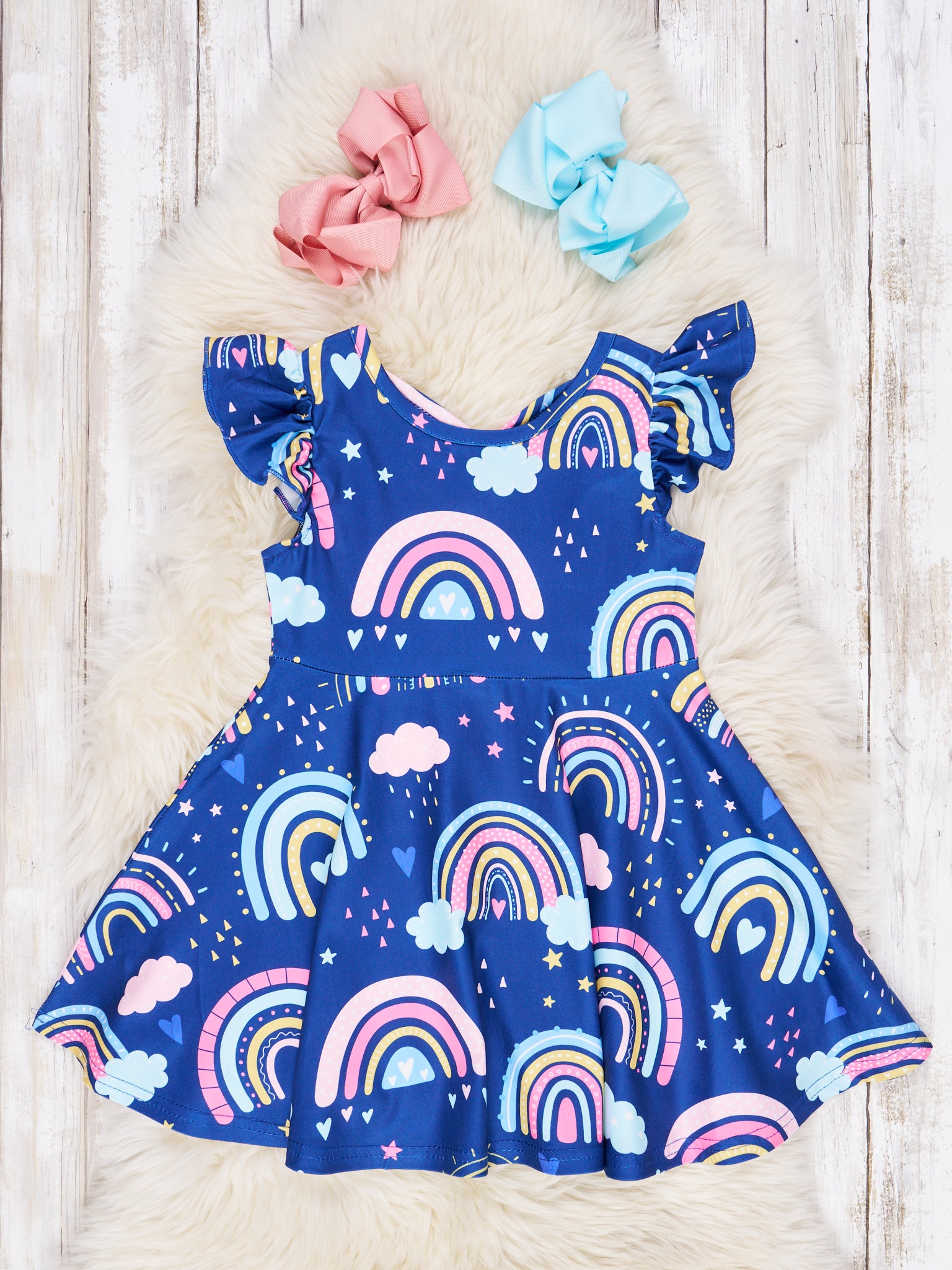 Let your little one light up the room with this super-cute sister set! Perfect for playdates or special occasions, this navy dress features a playful rainbow & hearts print, plus plenty of fun-loving ruffles. Let the good times roll!