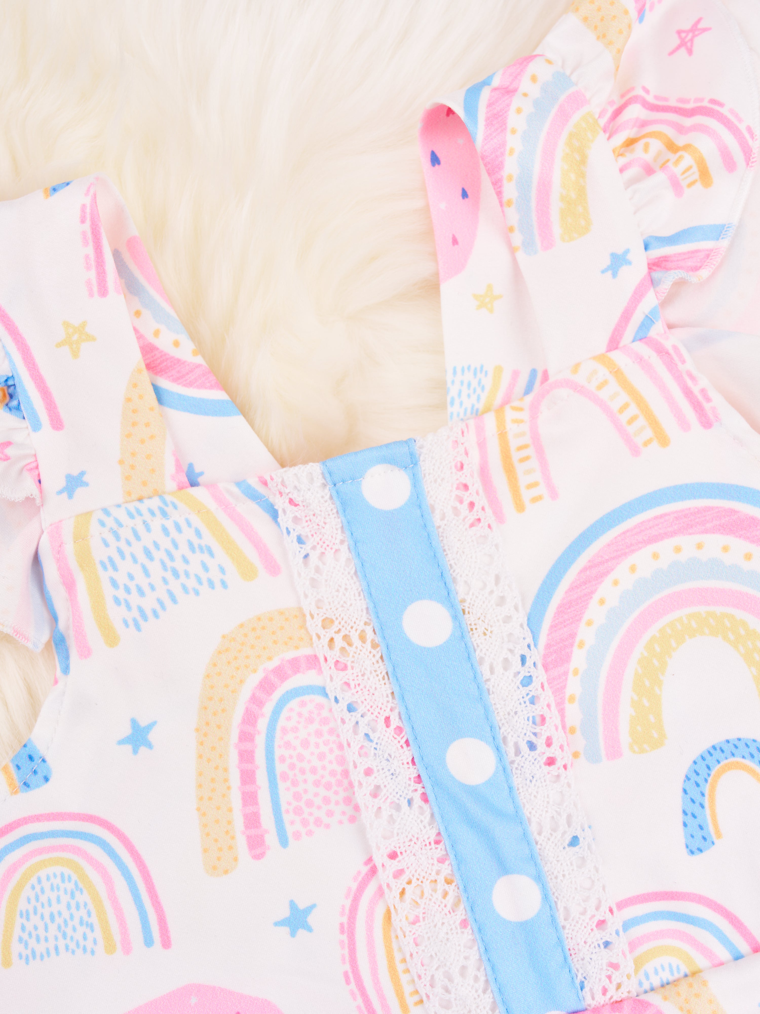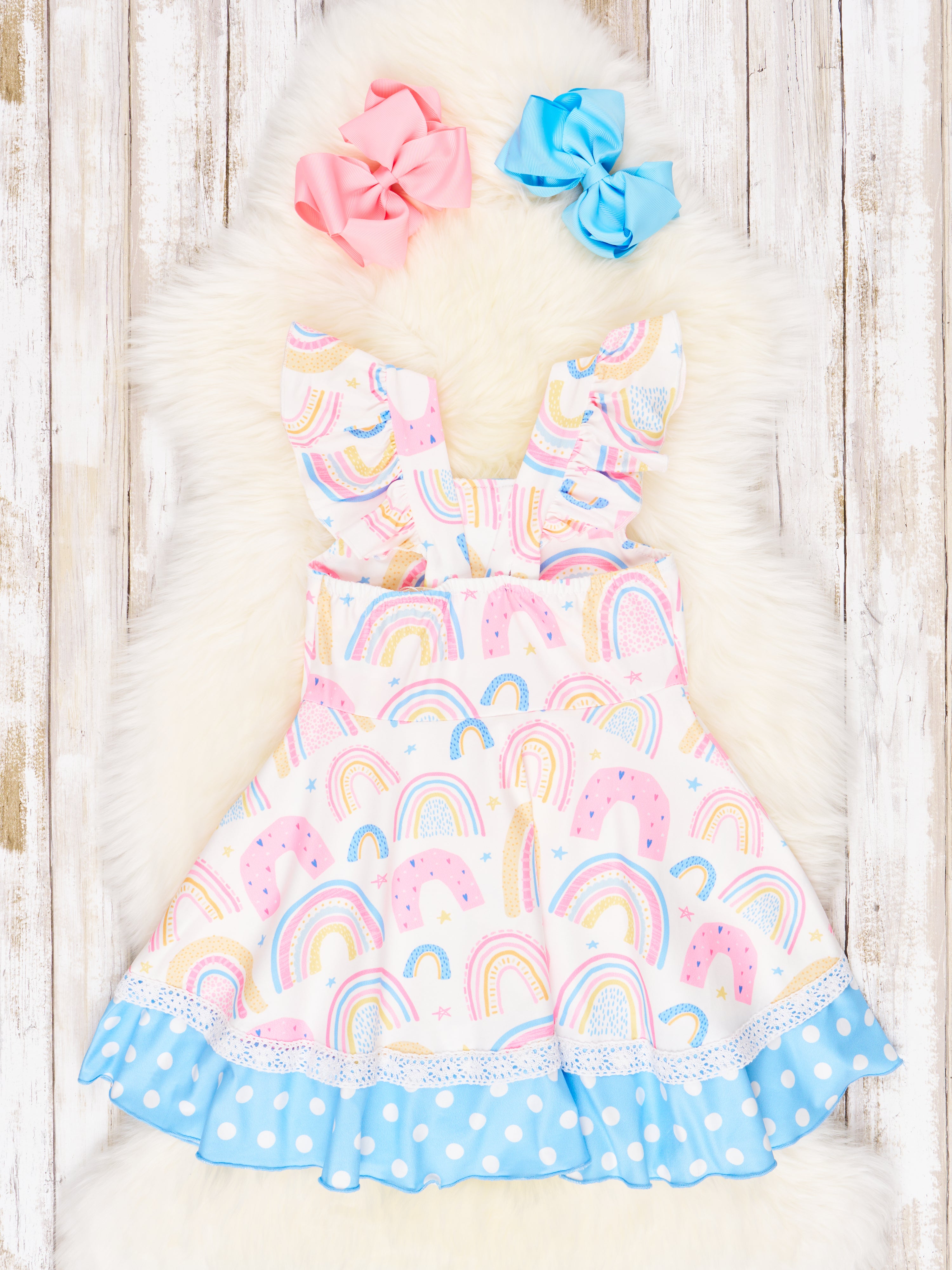 Welcome to the show-stopping sister set! Perfect for all occasions, this polka dot ensemble features a rainbow and star print with fluttery flutter sleeves for extra style. Let their inner star shine in this extraordinary dress!