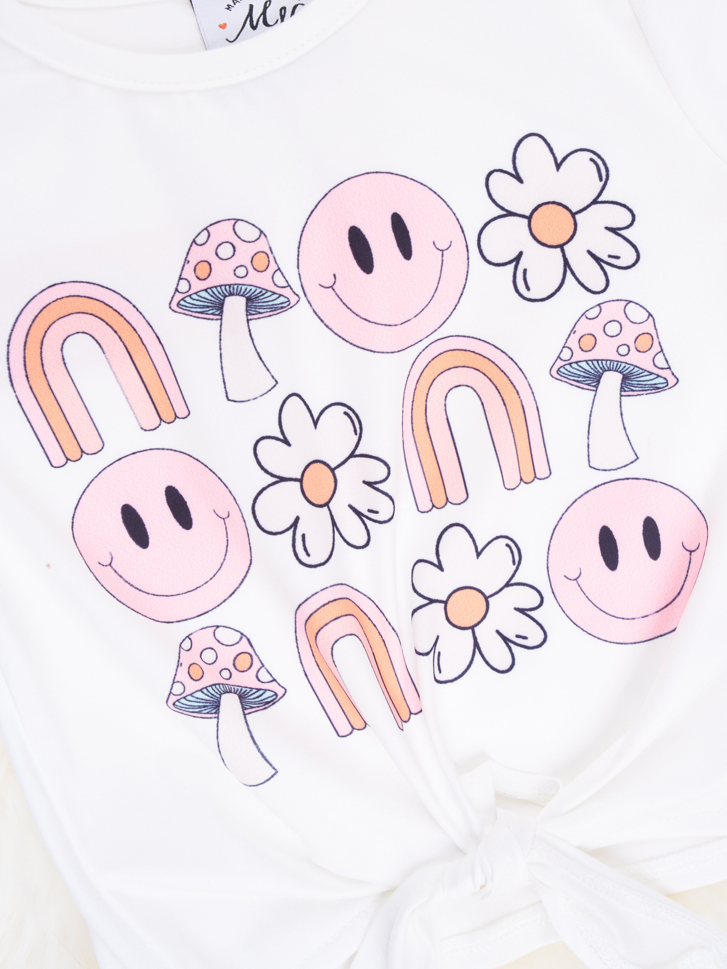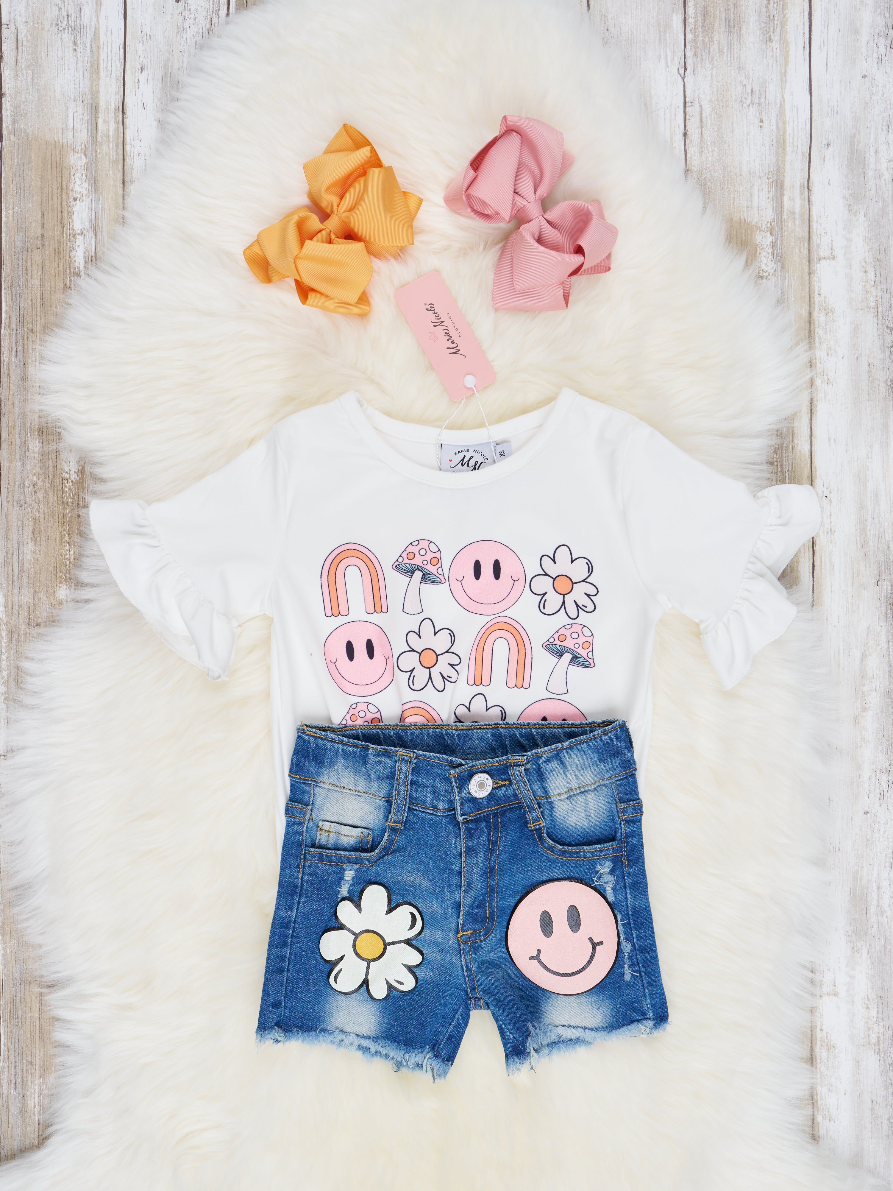 Let your kid dress to impress in this groovy Retro Smiley Denim Outfit! Featuring a tie top with a retro smiley, rainbow, and mushroom design, plus flouncy ruffle sleeves. And don't forget the denim shorts to match! Ready to kick it old-school and show off some serious style? Go for it!