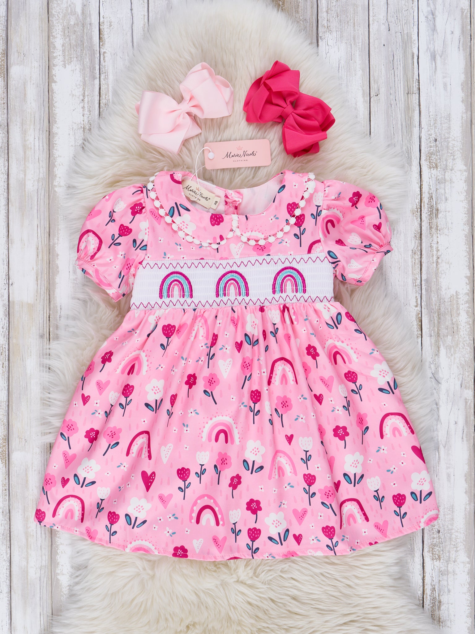 Share the rainbow with this sister set! This dress features puff sleeves, a lace trim peter pan collar, smocked rainbow detail, and a precious floral and rainbow print throughout.