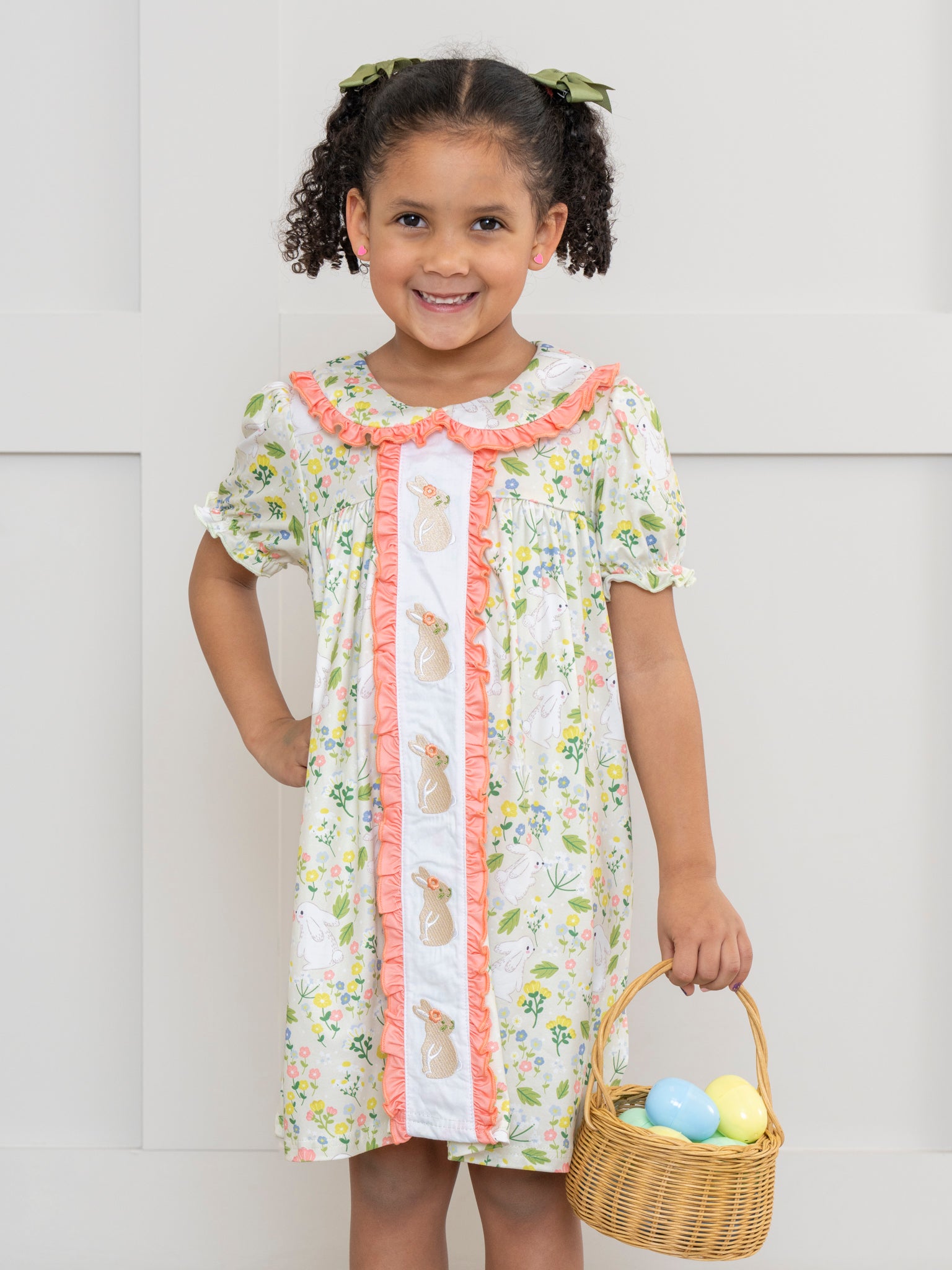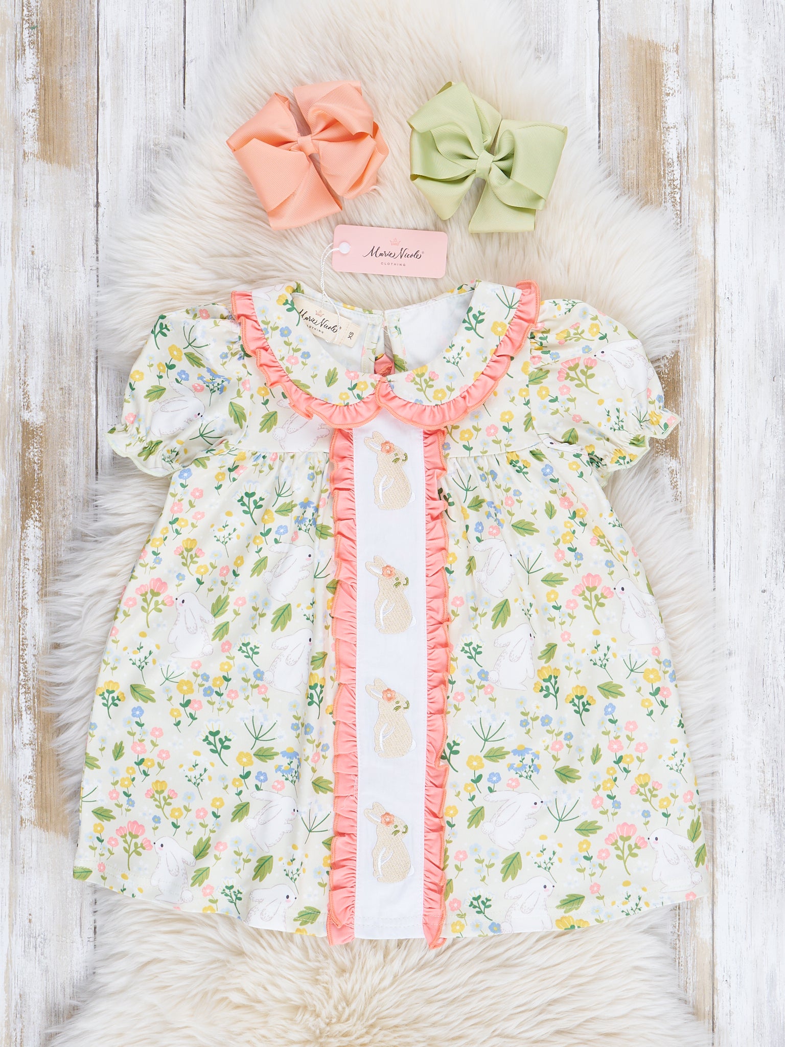 Coral & Green Embroidered Bunnies Ruffle Dress