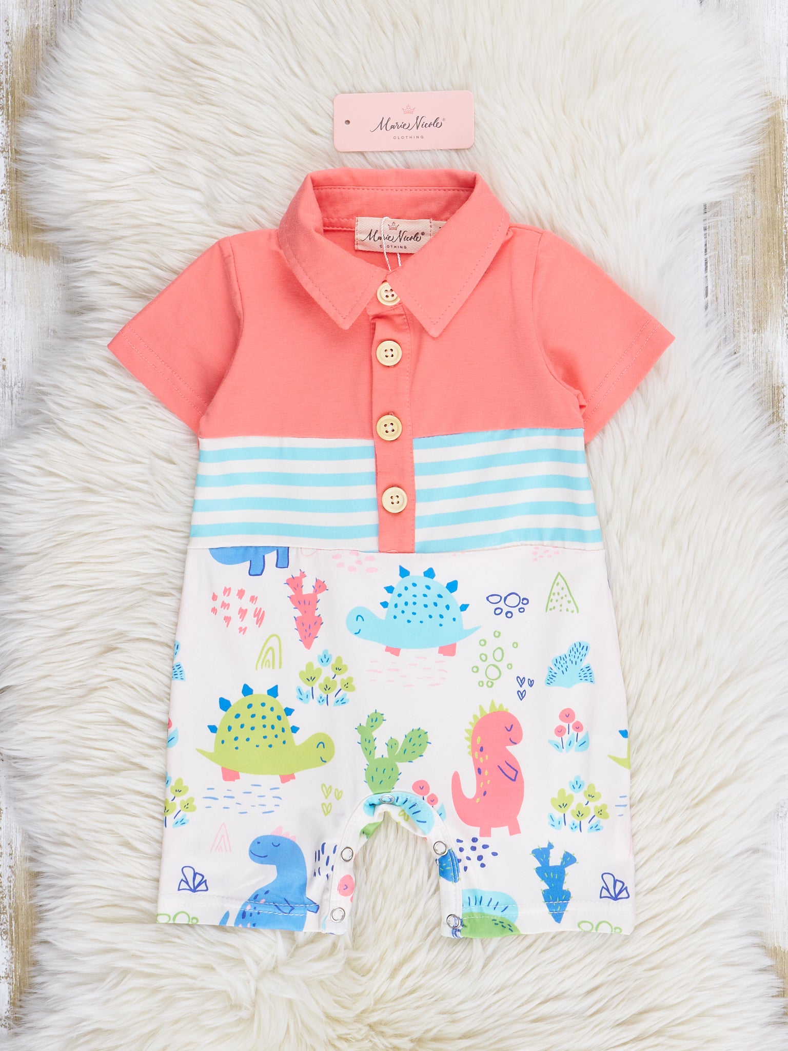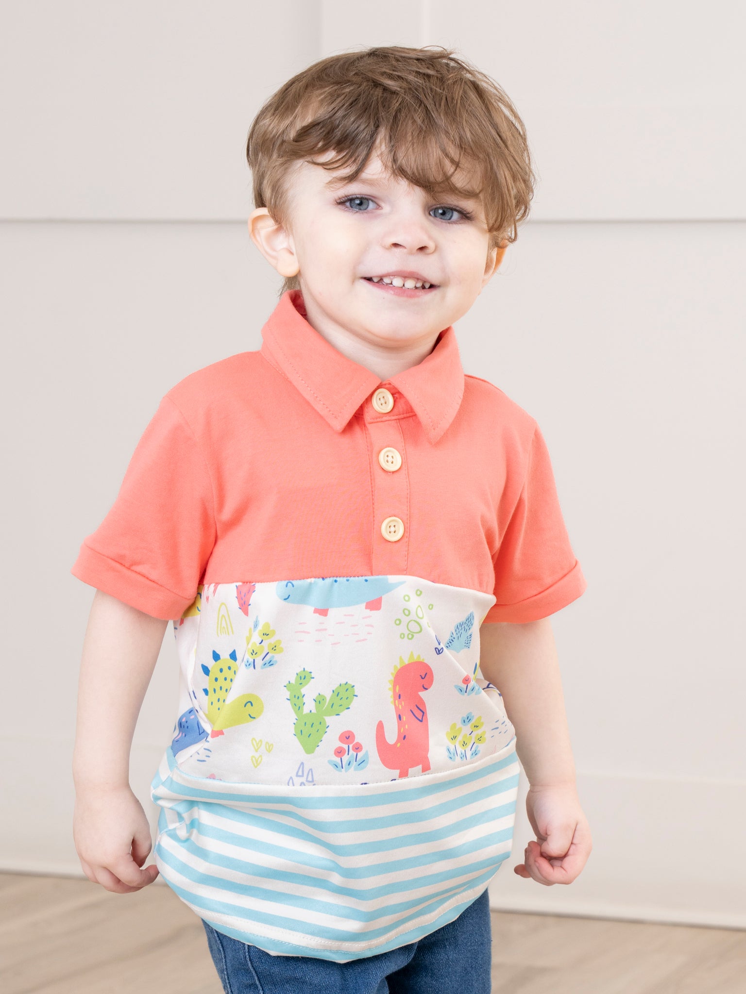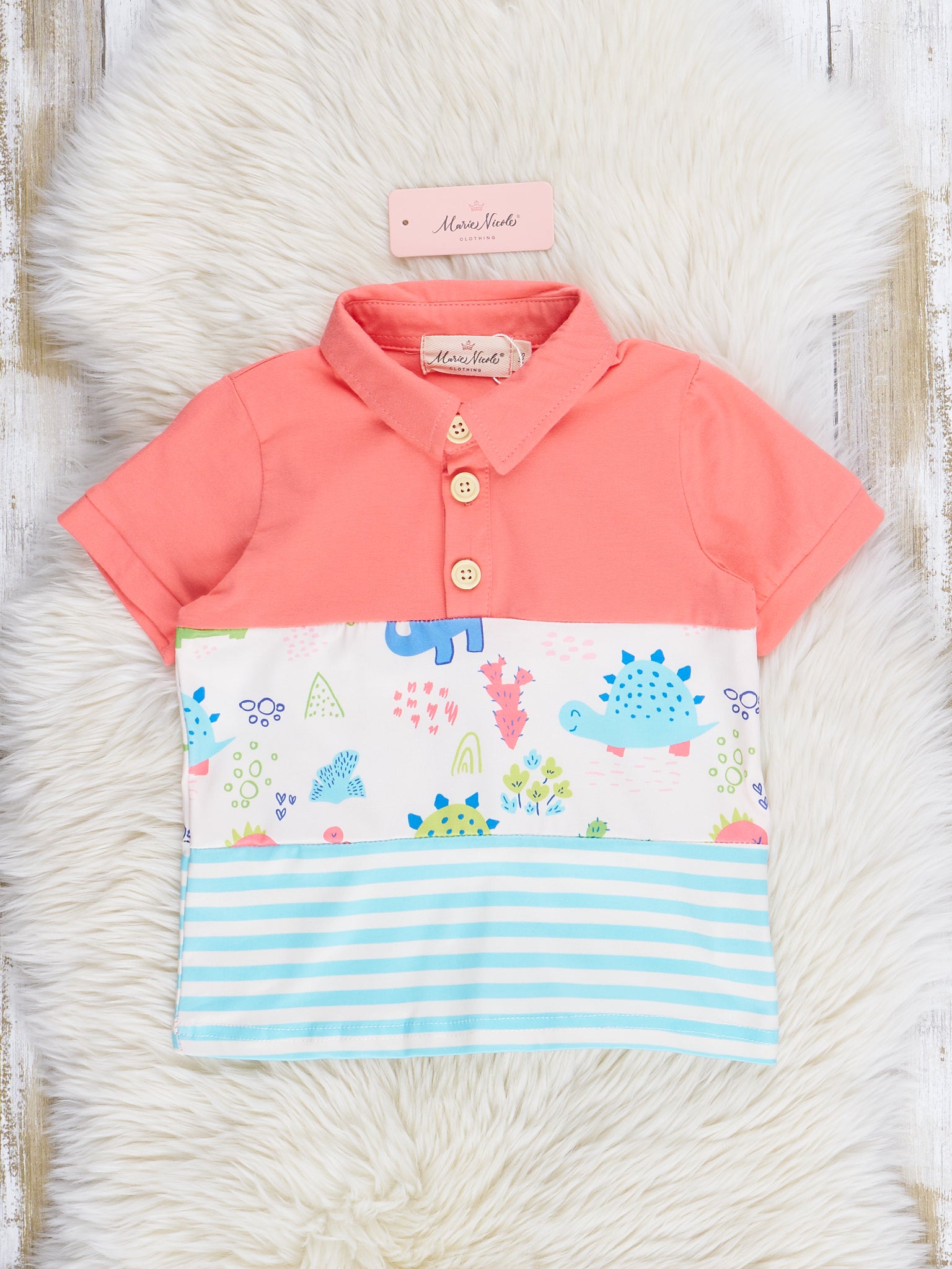 Coral & Teal Dinosaur World Polo Romper