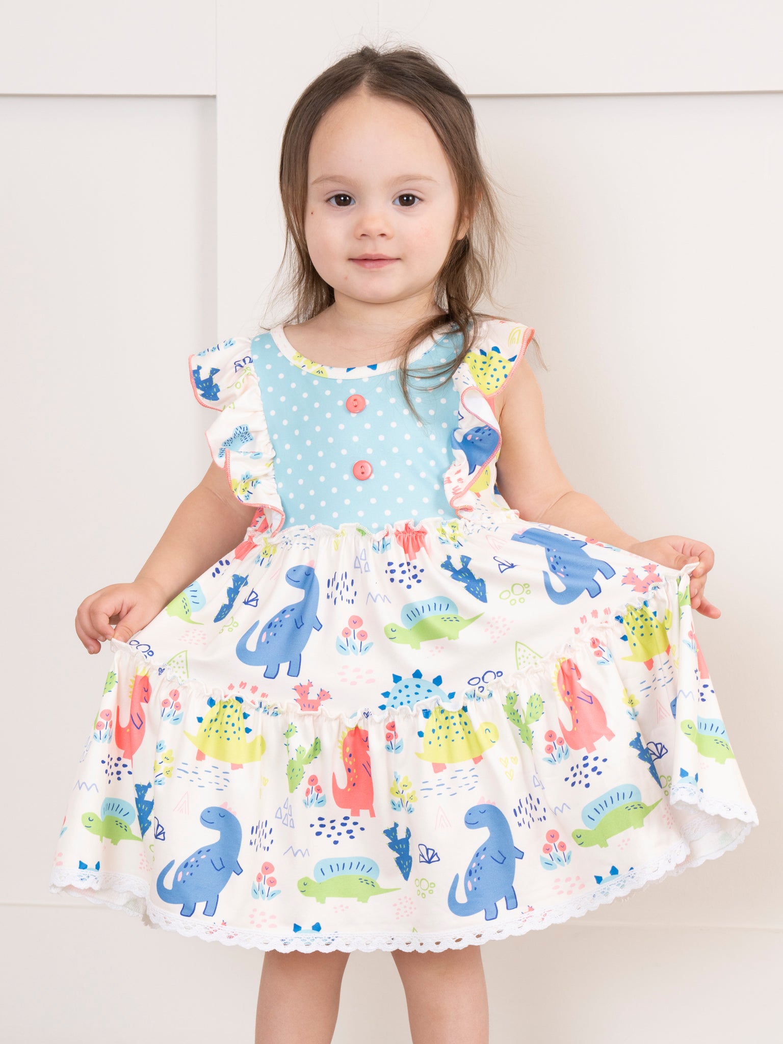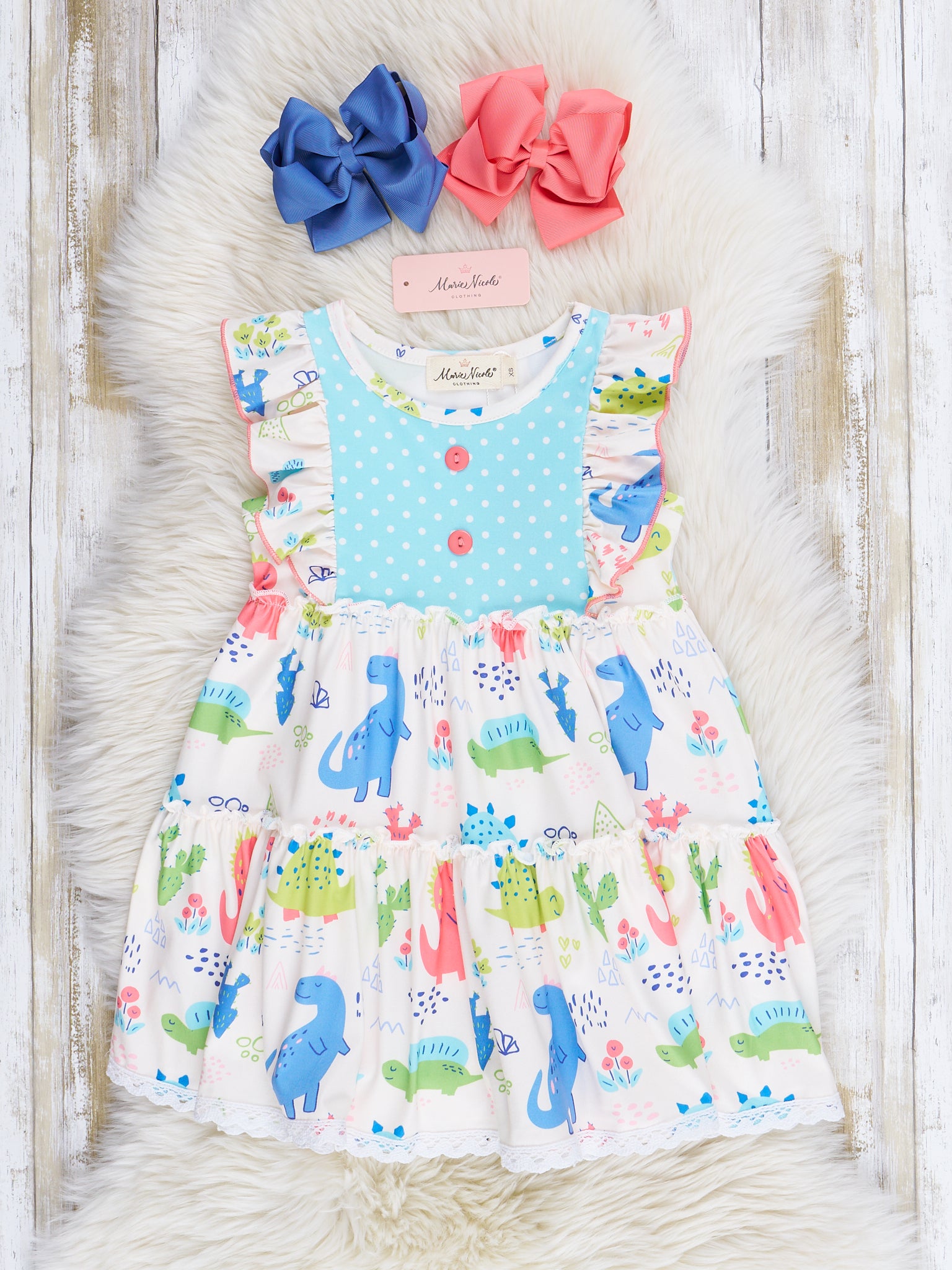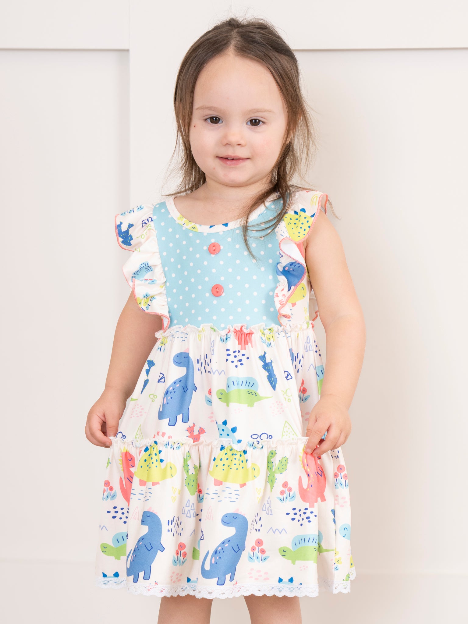 Coral & Teal Dinosaur World Ruffle Dress