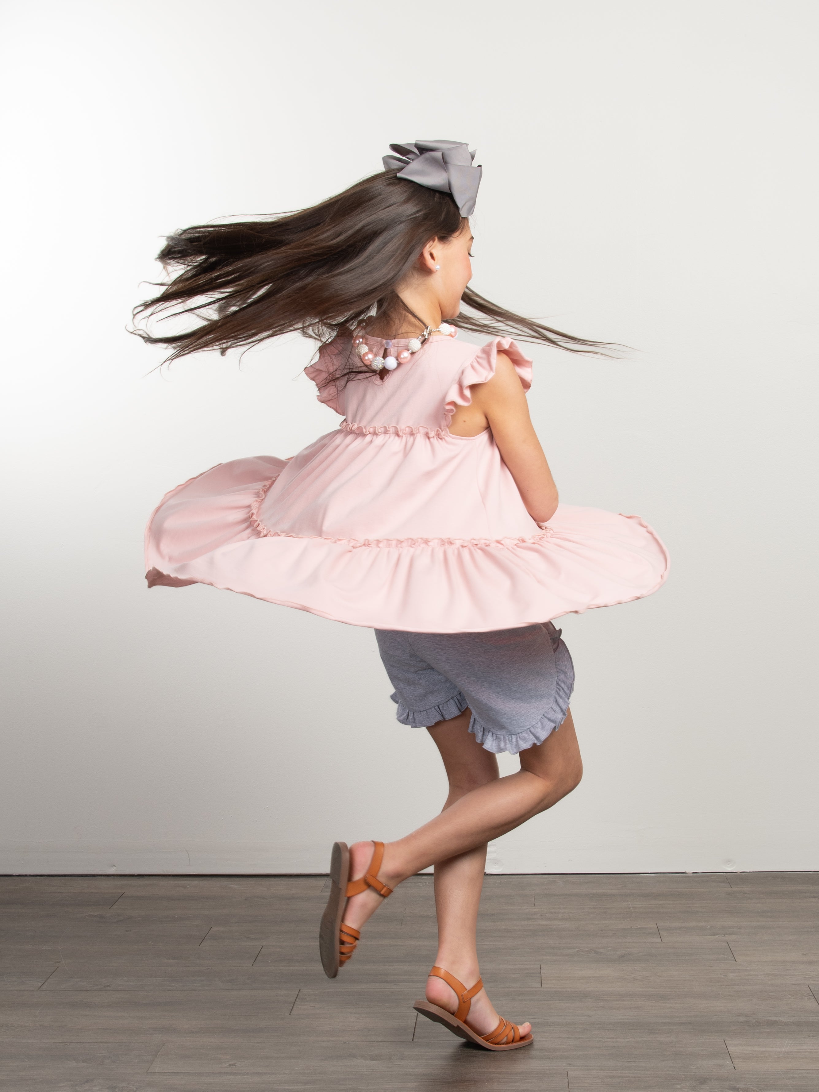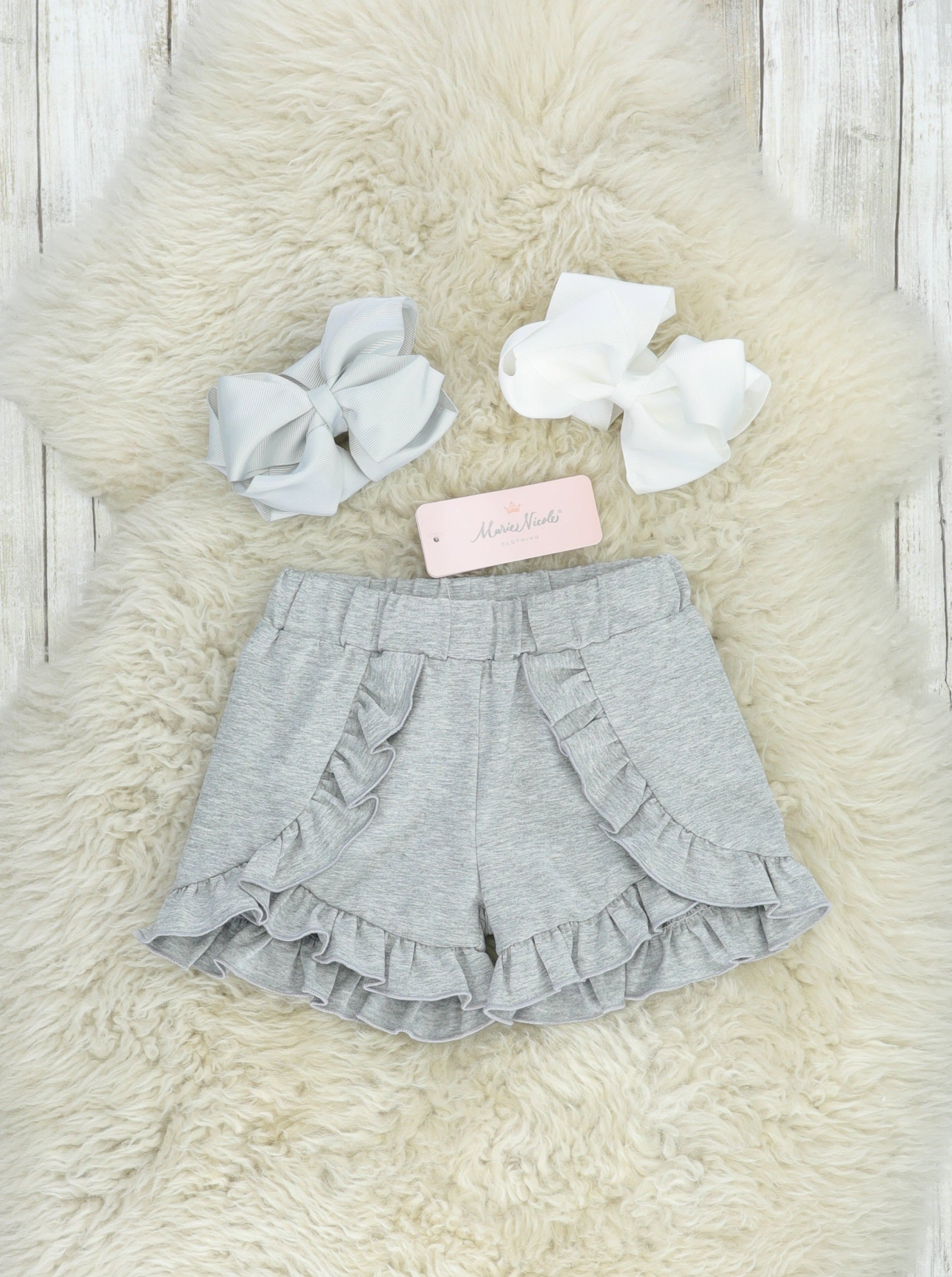 Our Cotton Ruffle Shorts are back & better than ever! These heather grey shorts feature ruffles & an elastic waistband for easy changing!