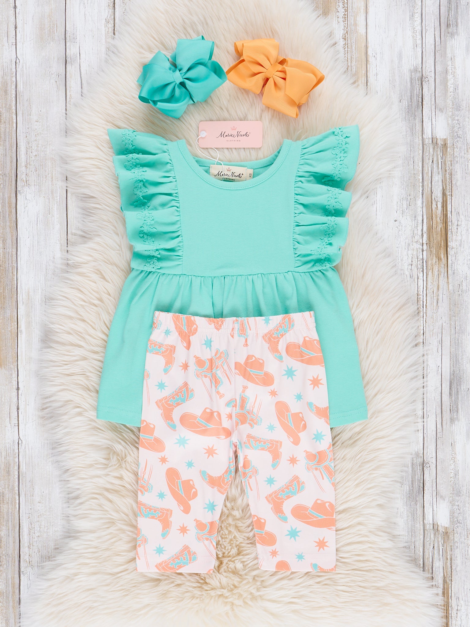 Yeehaw! Little cowgirls will love this girls' outfit from Marie Nicole Clothing. Featuring a turquoise ruffle swing top and cowboy boots & hats printed leggings, it's perfect for summer. Get your little one ready to wrangle in style!
