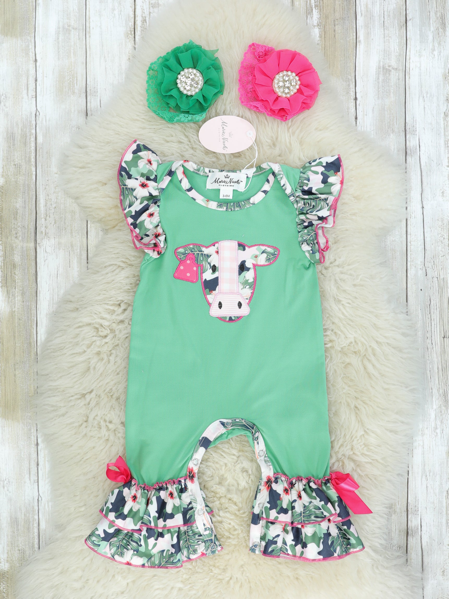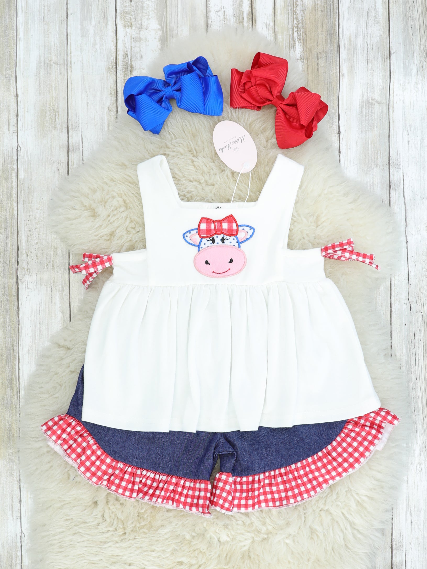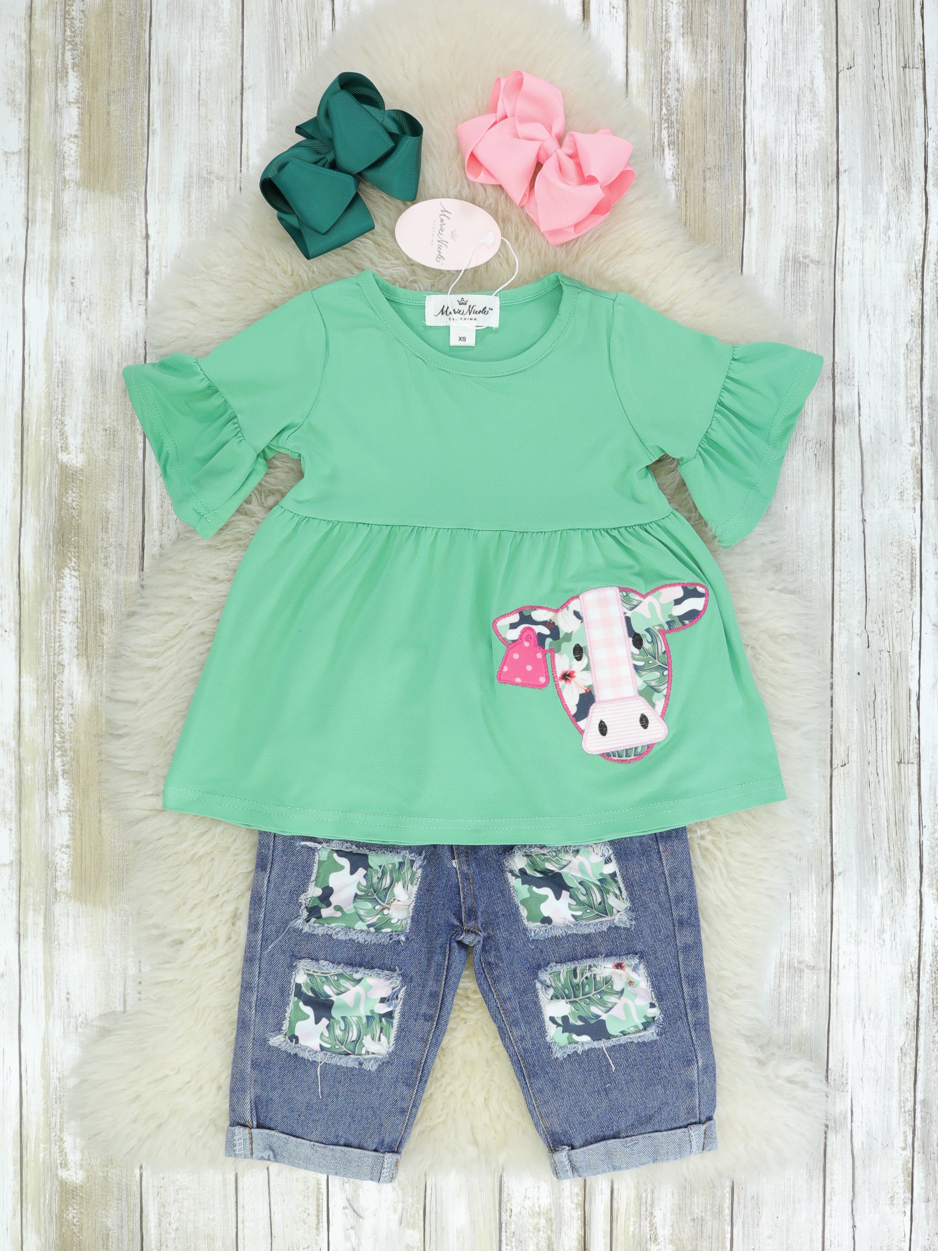Green Cow Ruffle Tunic & Distressed Denim Capris