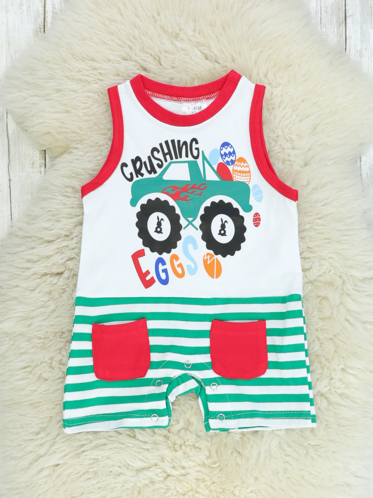 Your littles will be crushing those Easter egg hunts in this brother set! This romper features a red neckline & pockets, green & white stripes, & a "Crushing Eggs" monster truck detail.