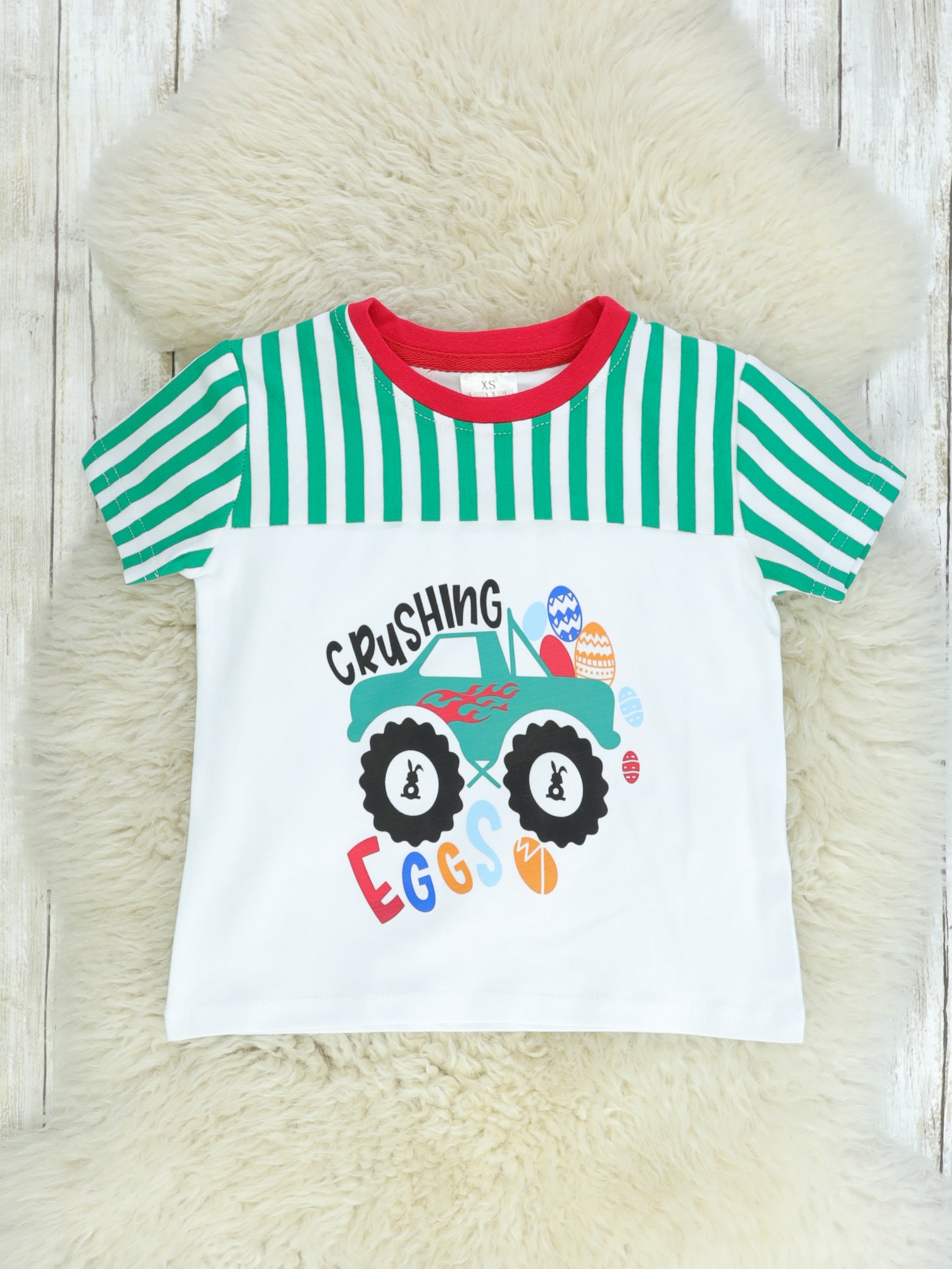Your littles will be crushing those Easter egg hunts in this brother set! This shirt features a red neckline, green & white stripes, & a "Crushing Eggs" monster truck detail.
