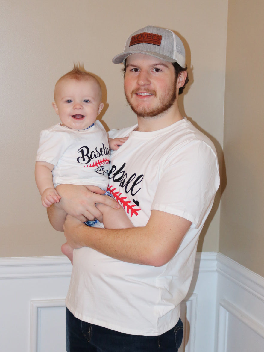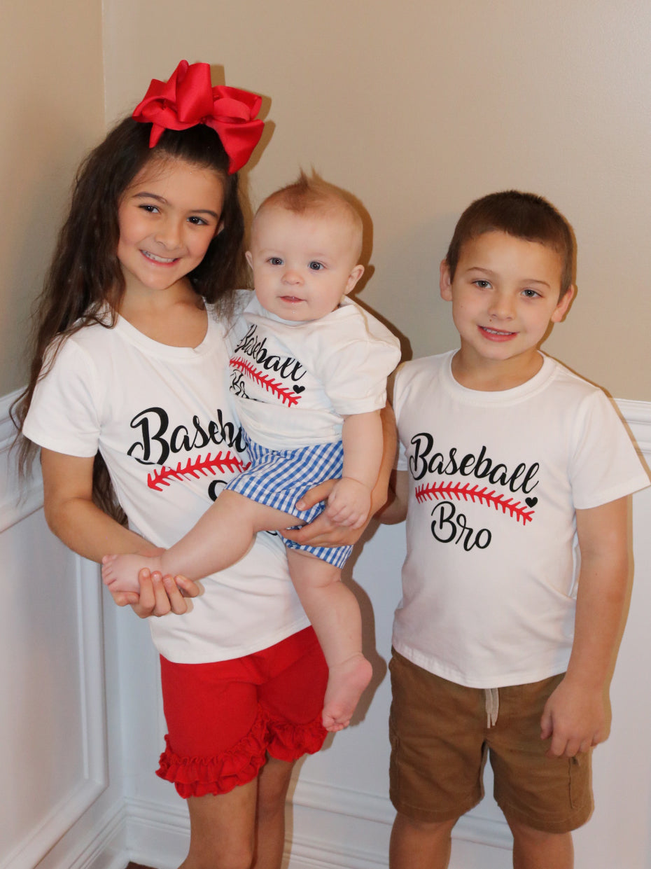 The perfect set for the whole family to enjoy the game! These white shirts feature sweet baseball details for "Bro", "Sis", "Mom", & "Dad".
