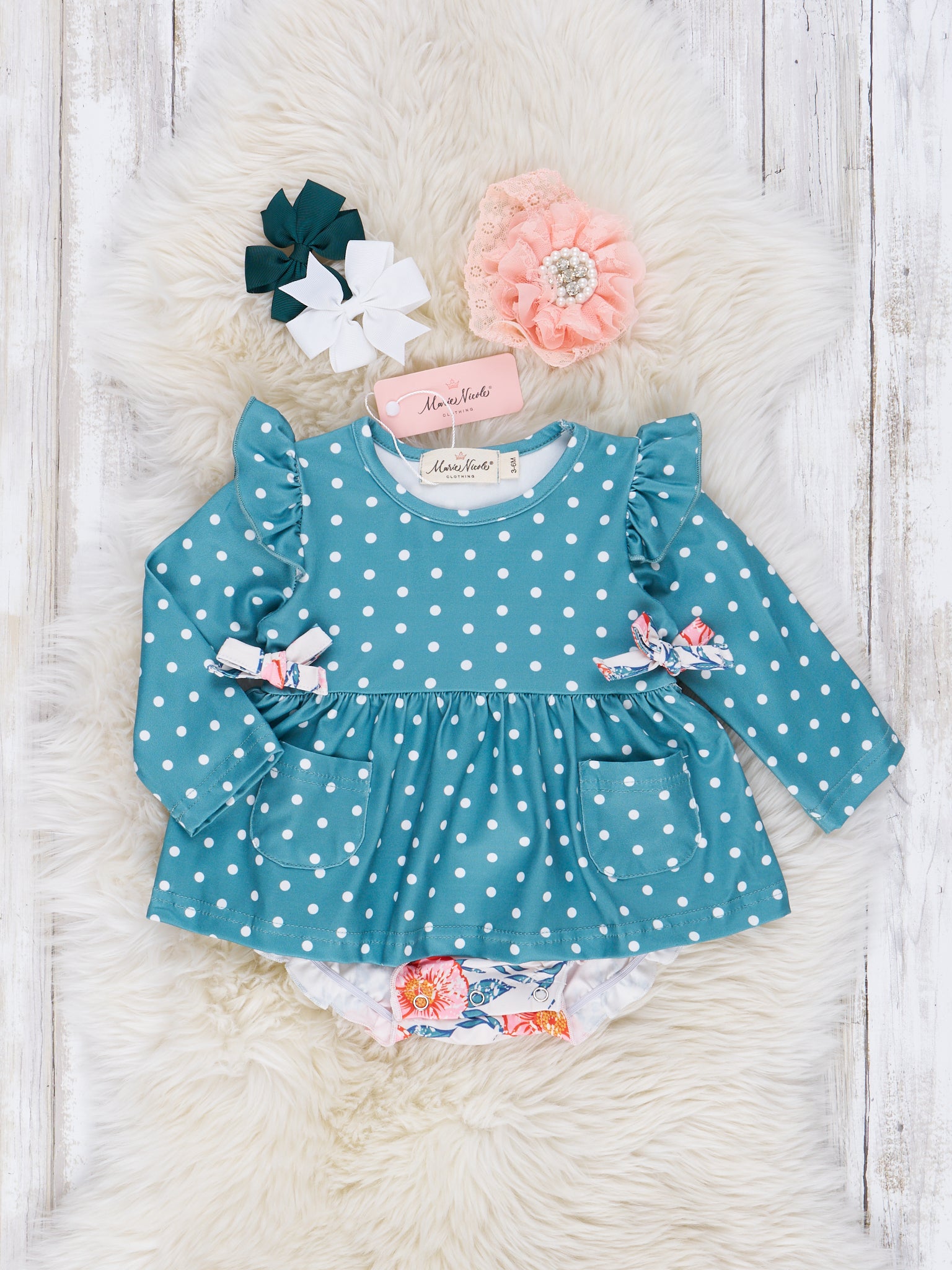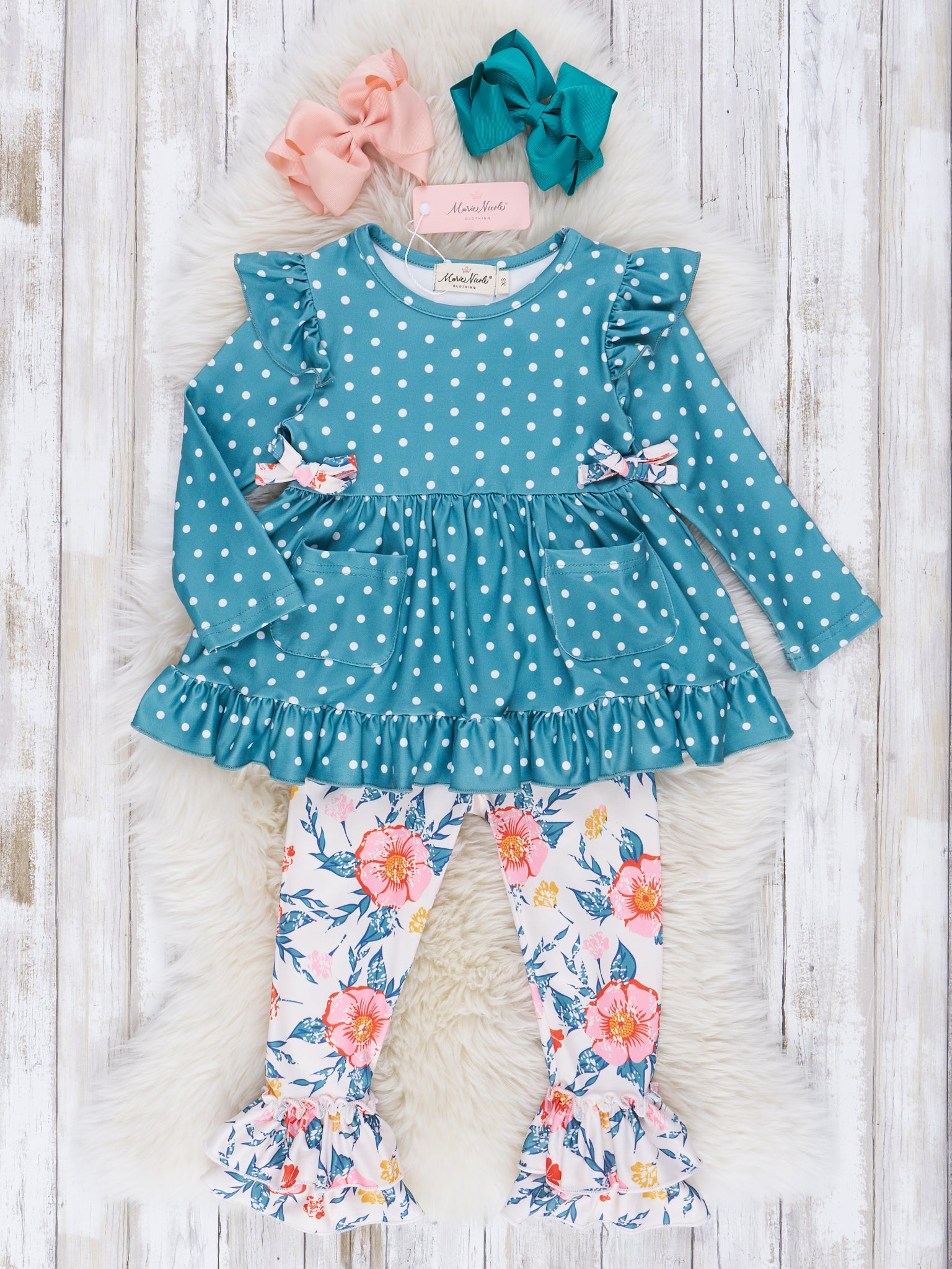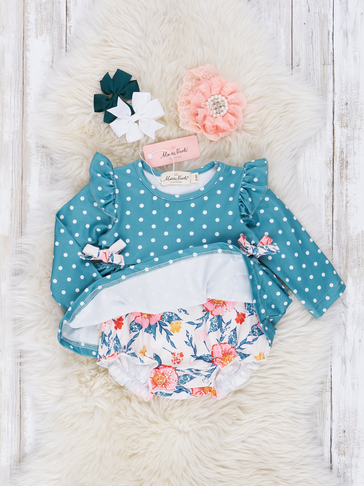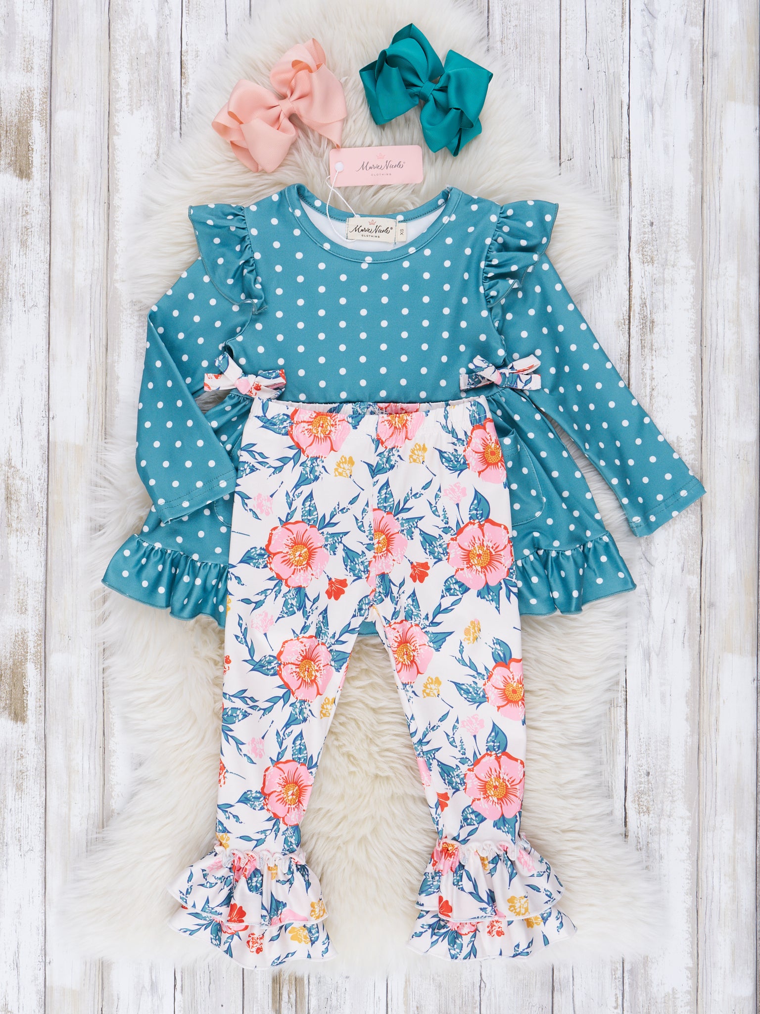 Dark Teal Polka Dot & Floral Ruffle Outfit