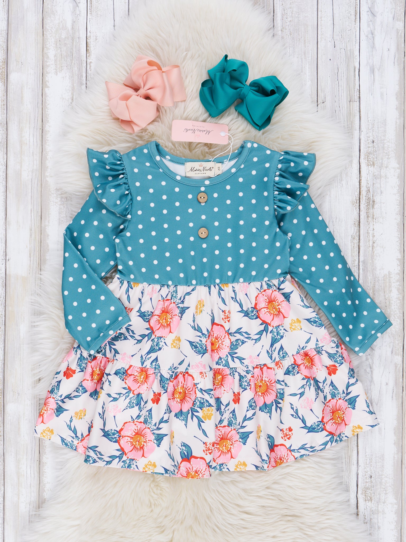 Home › Dark Teal Polka Dot & Floral Sister Set
