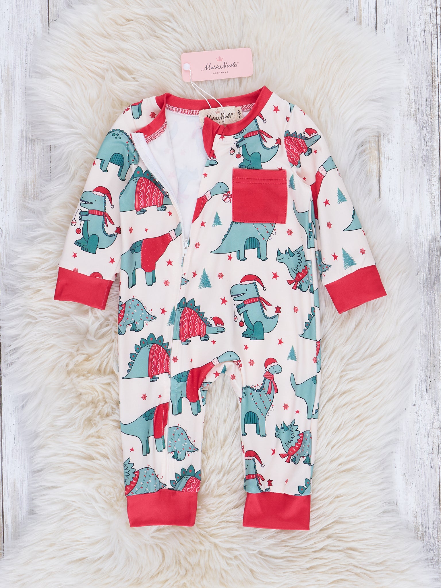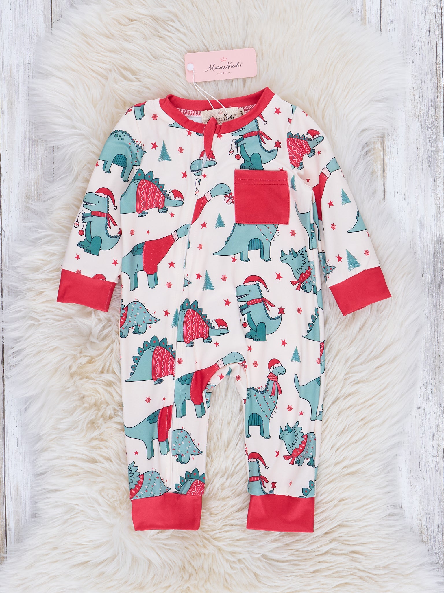 Dream of a RAWR-filled Christmas in these cozy romper pajamas! A must-have sibling set, each featuring dinosaurs decked out in holiday looks and sweet red trim and pocket. Sweet dreams!