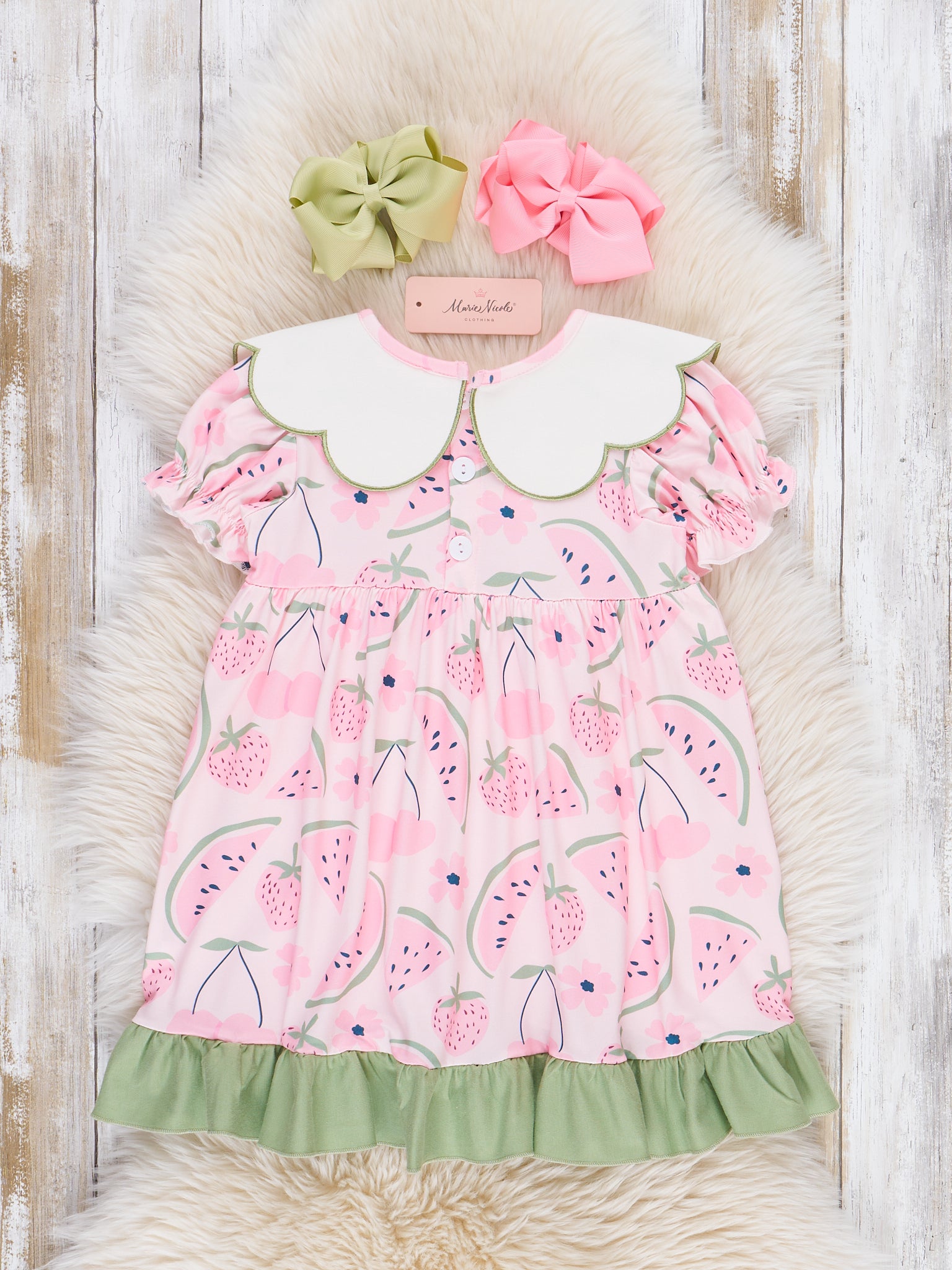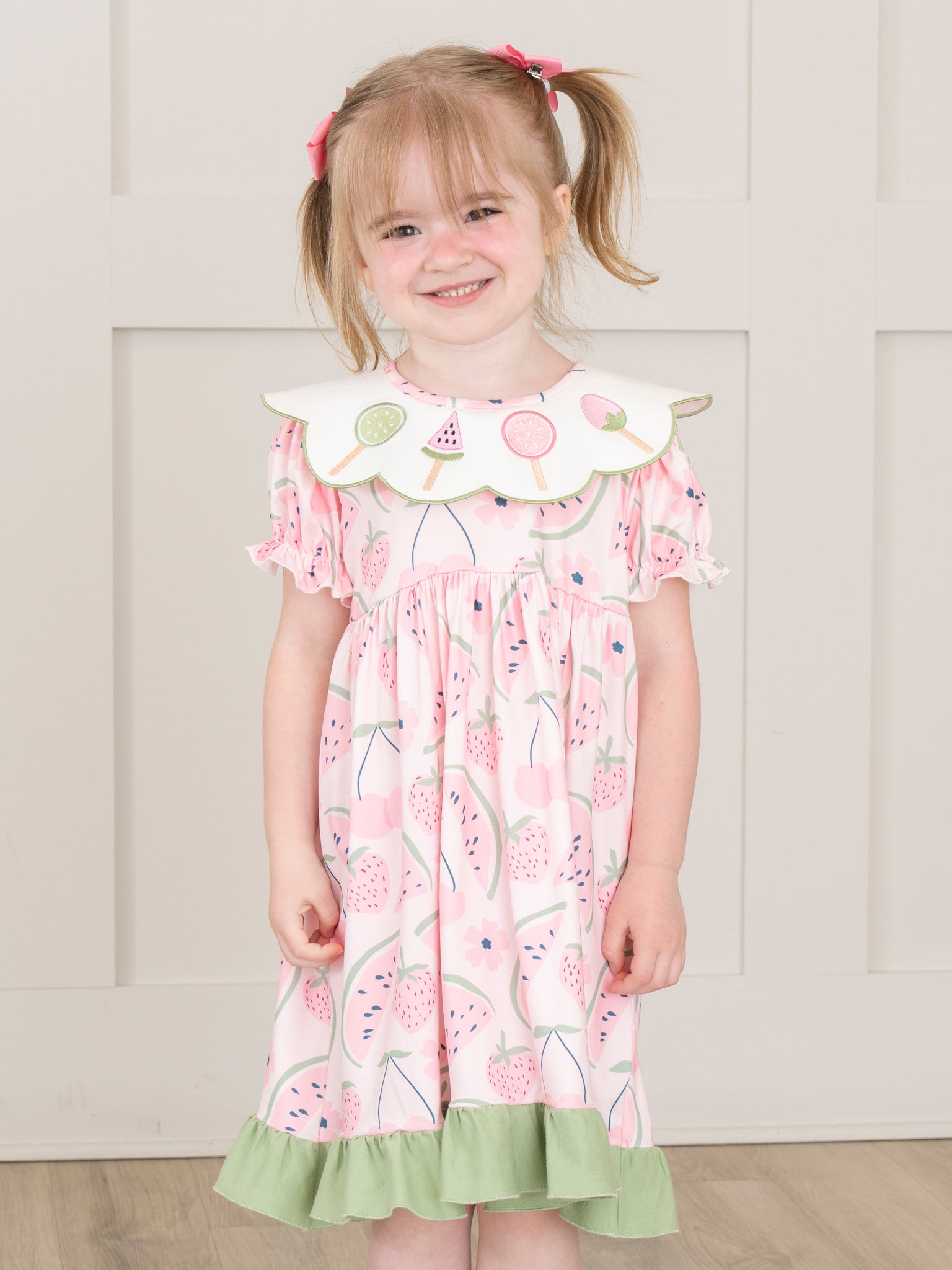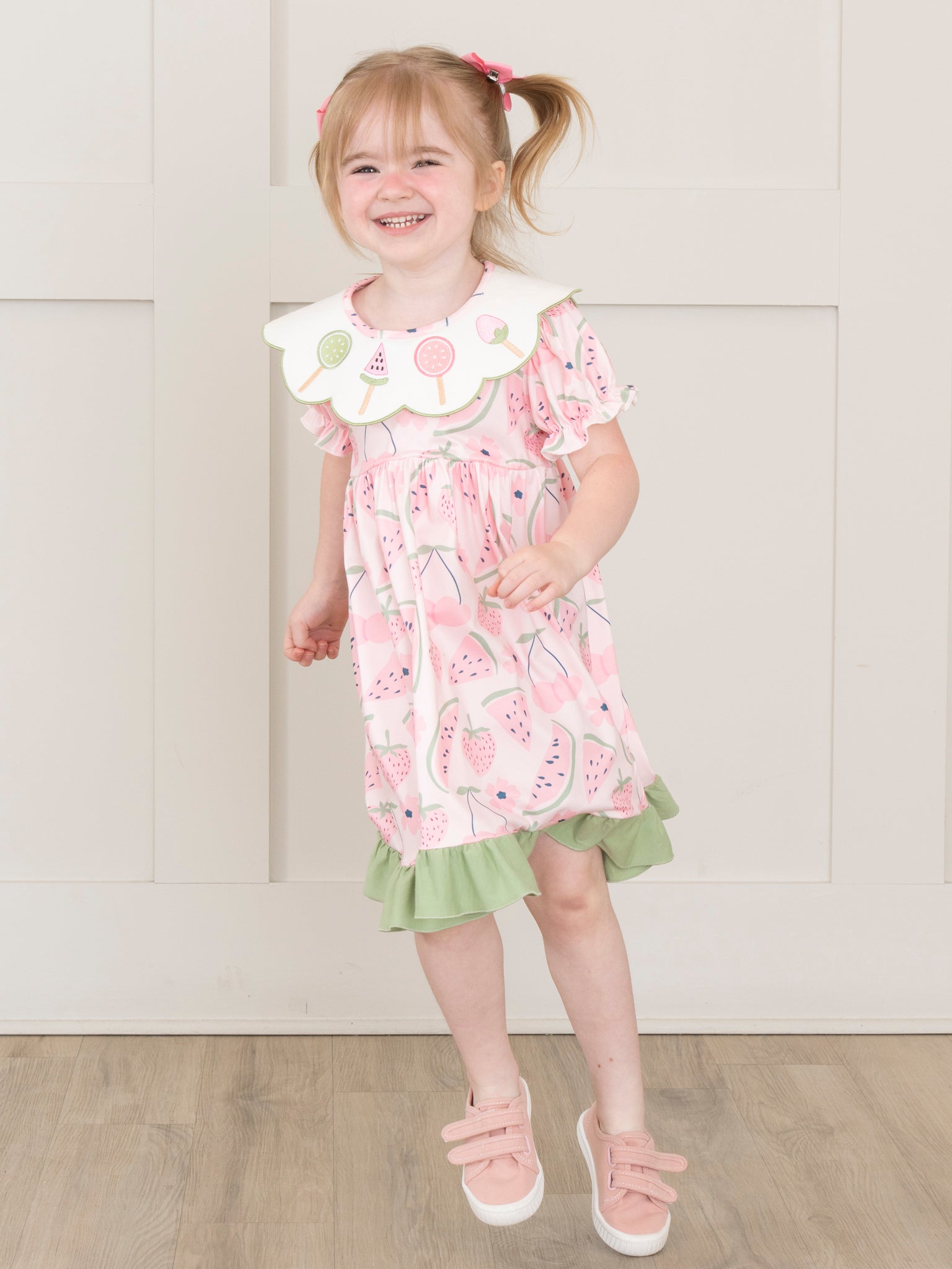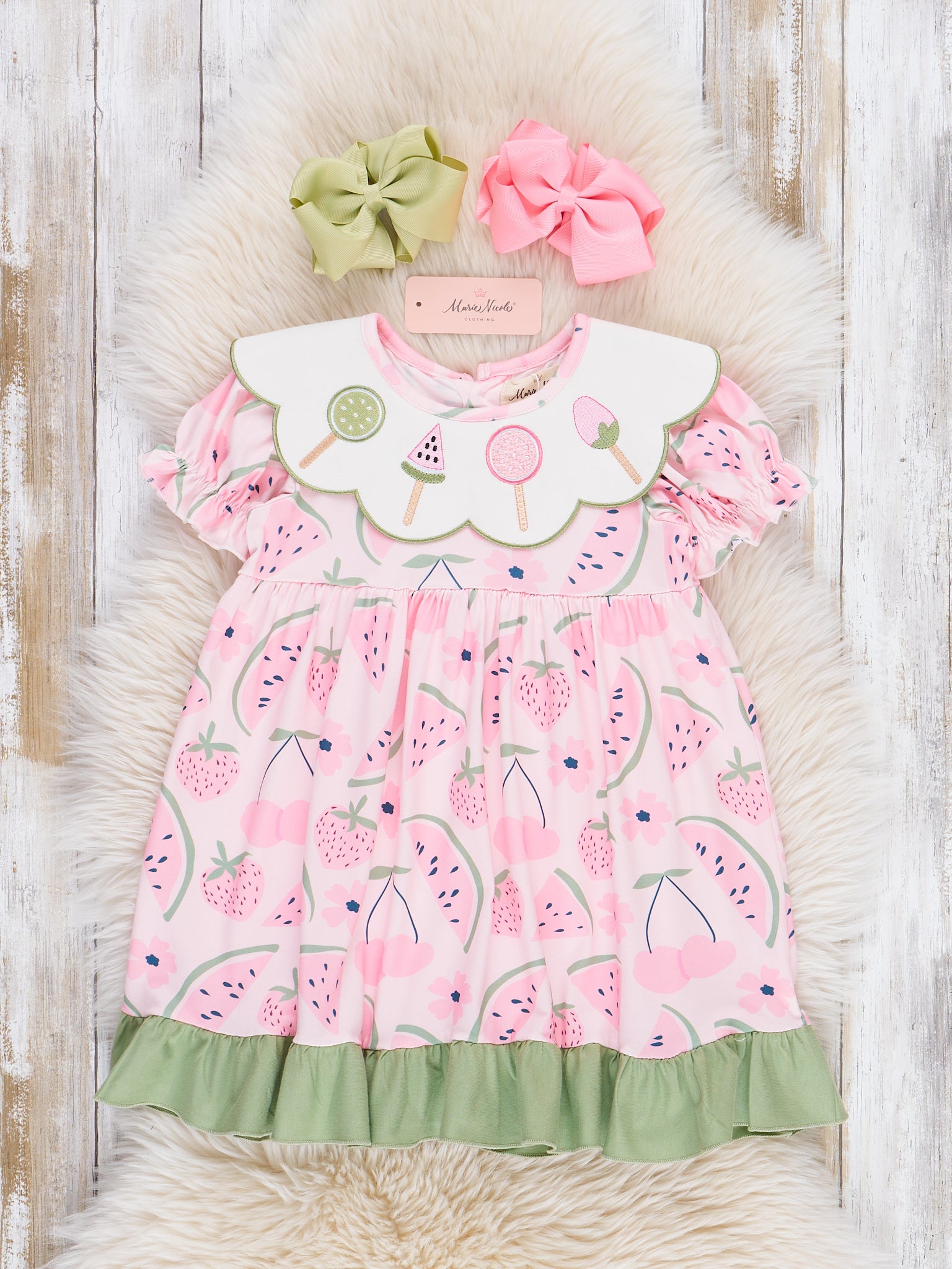 Get your little one ready for summer with our Watermelon Pops Embroidered Ruffle Dress. This fun and playful dress features a cute watermelon print, a vibrant green ruffle hem, and a scallop collar adorned with embroidered summer treats. Designed by Marie Nicole Clothing, it's the perfect addition to your little girl's wardrobe!