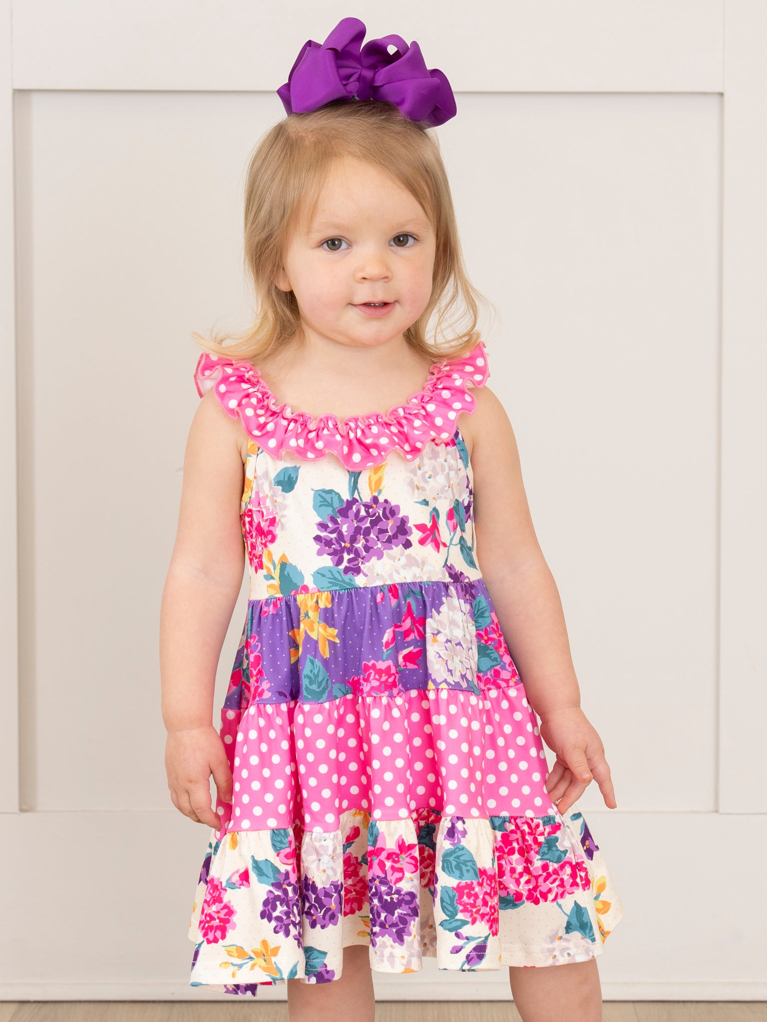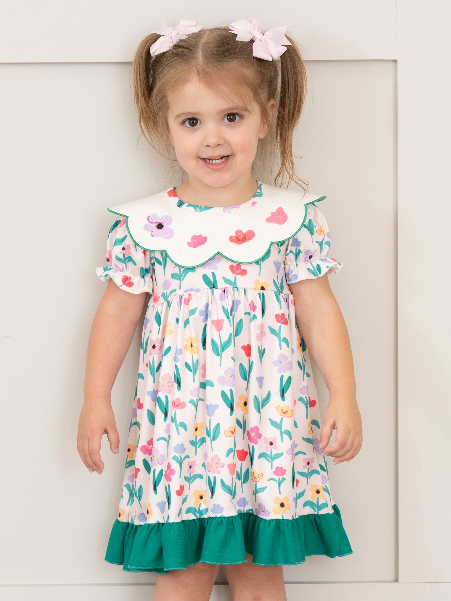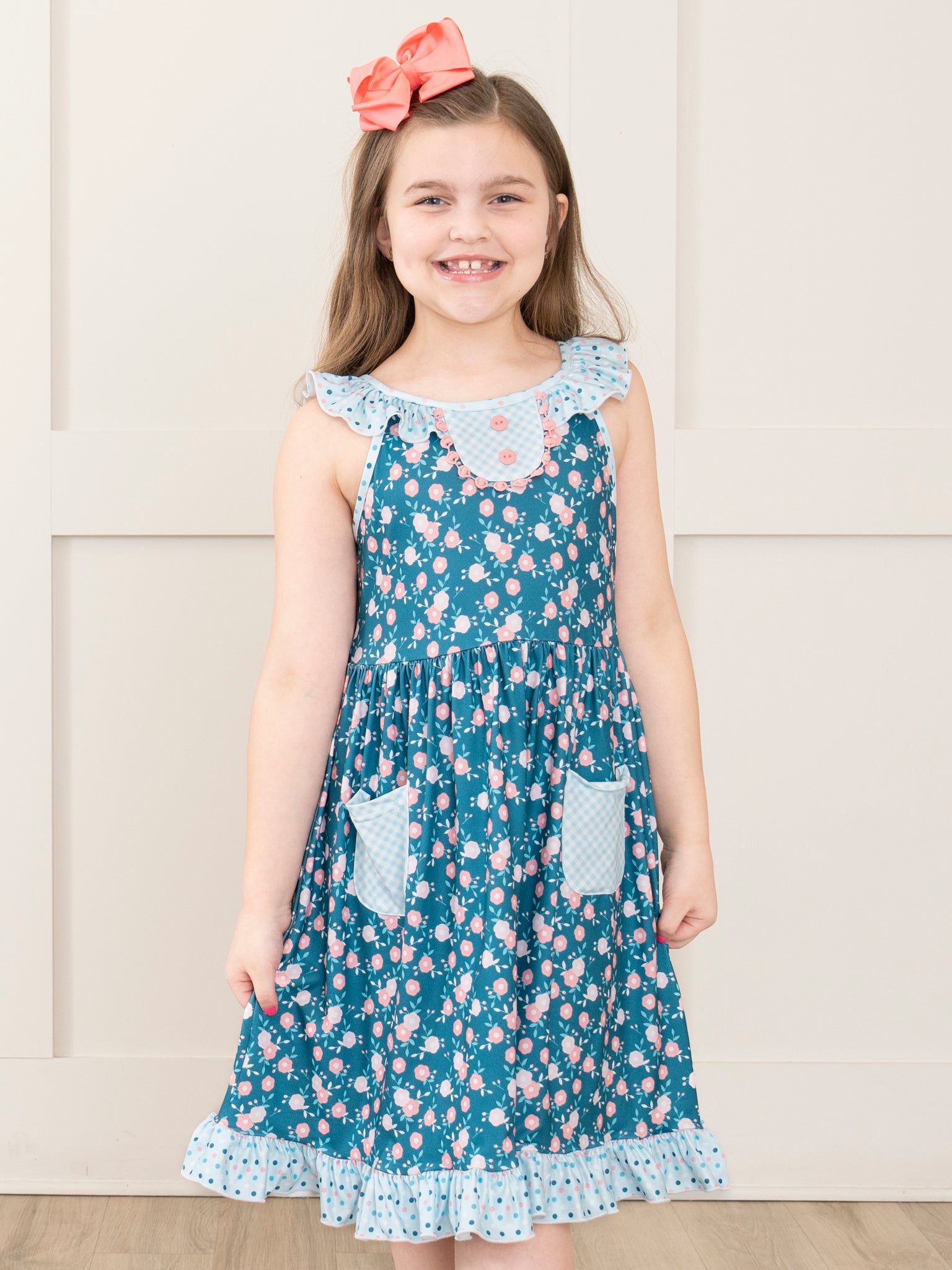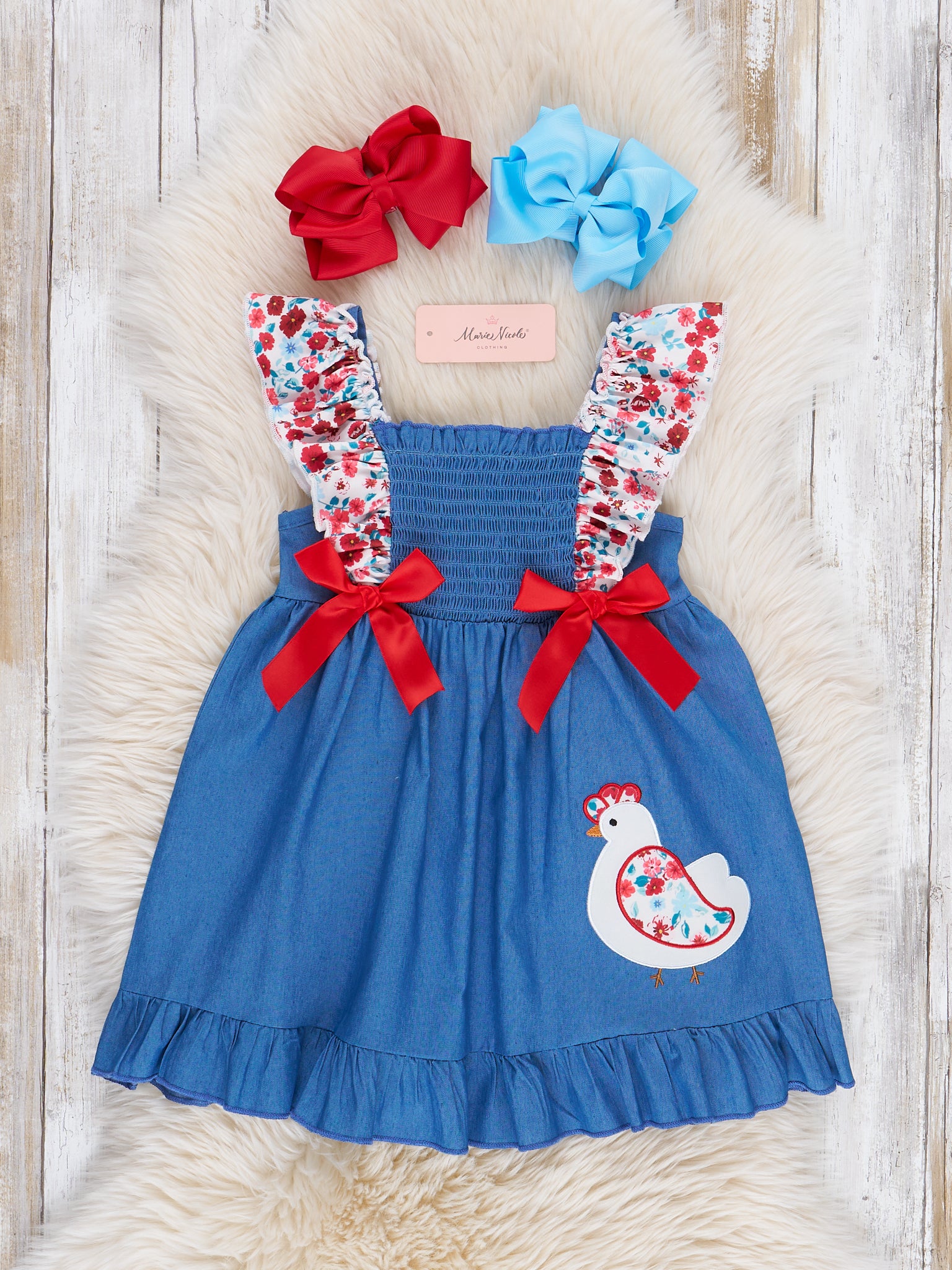 Chambray Embroidered Floral Chicken Ruffle Dress