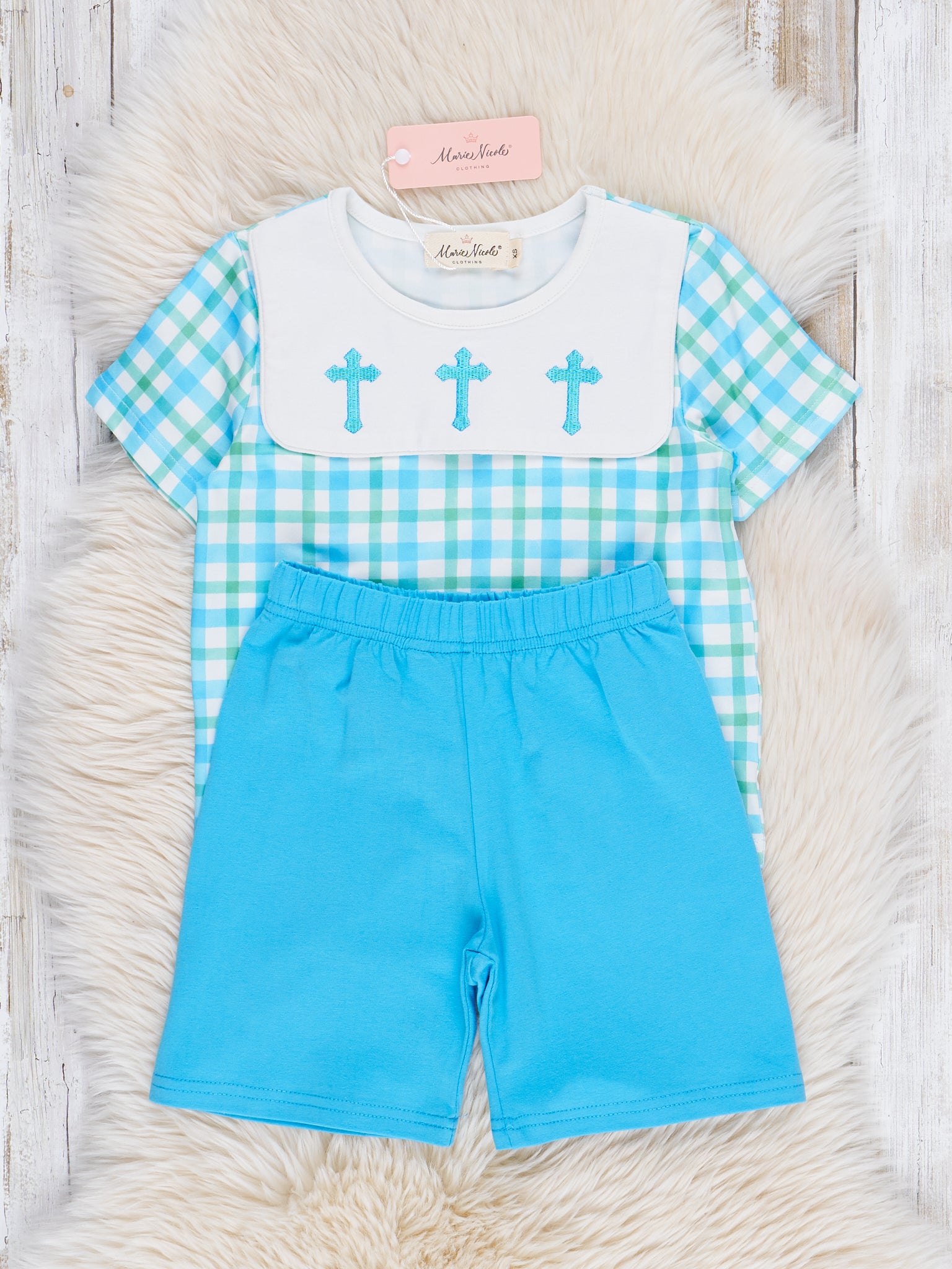 Bring some color to your Sunday best with this unique and playful outfit! The turquoise blue plaid top by Marie Nicole Clothing features embroidered crosses over a sweet bib detail. The matching shorts complete the look, making this a perfect Easter look. Shop the matching brother set for even more Easter fun!