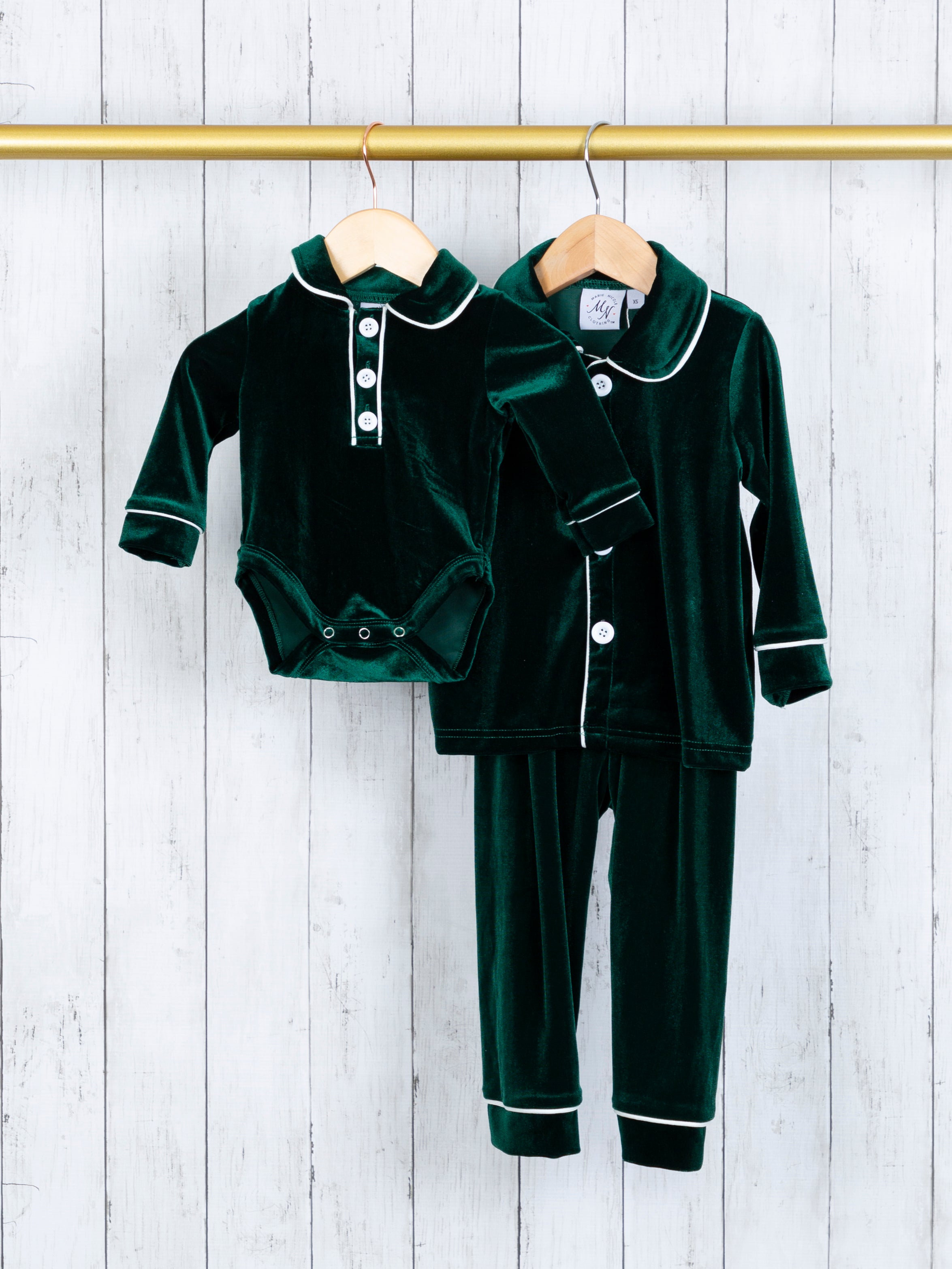 The softest sibling set for all the kiddos! This velvet romper features decorative buttons & a collar.