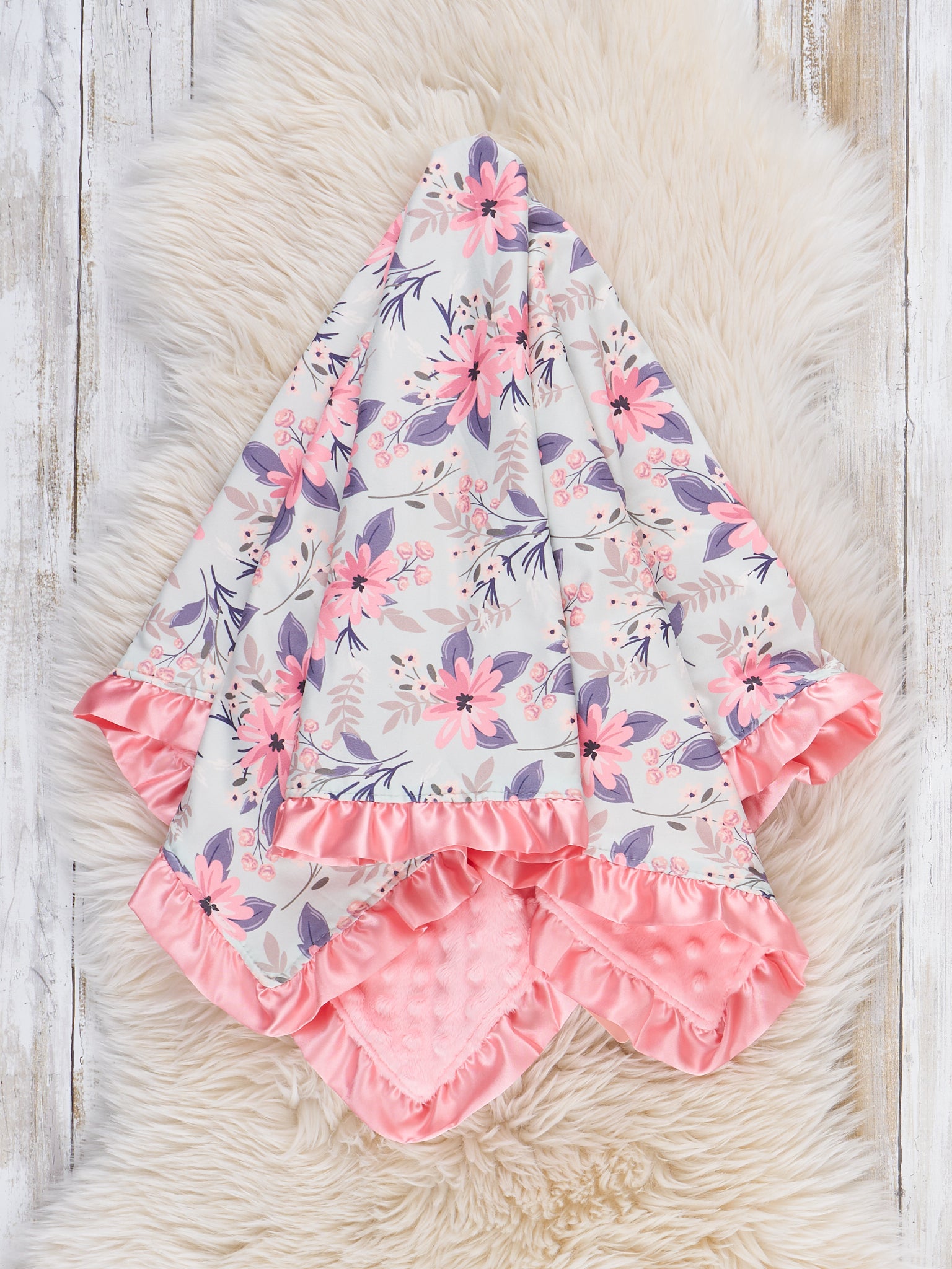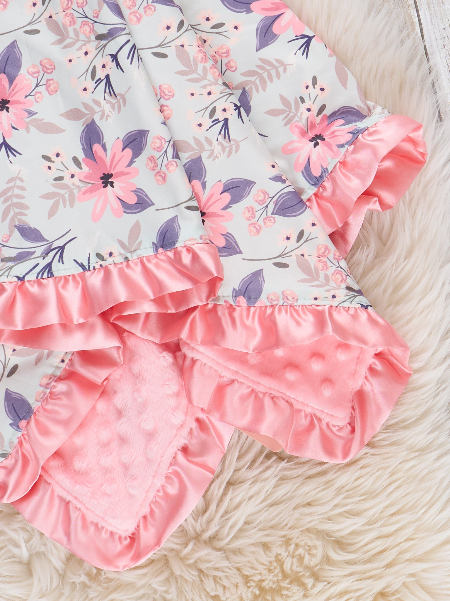 The Pinky Blooms Blanket by Marie Nicole features a cozy, textured design with a soft floral print on one side and a plush, minky fabric on the other. The blanket is finished with a ruffle trim, adding a delicate, charming touch that's perfect for snuggling or nursery decor.