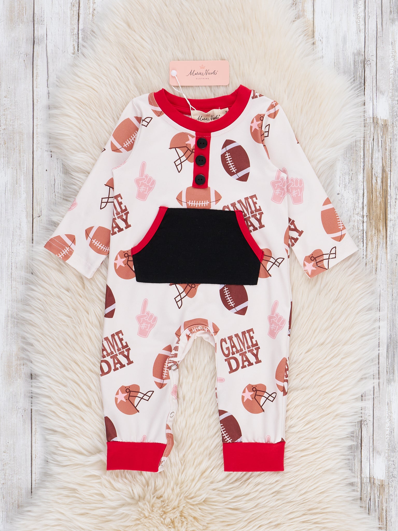 Get comfy for gameday with the Kickoff Pocket Romper! This Marie Nicole Clothing one-piece is a trendy and casual romper with an exciting pattern of iconic football symbols, finished with a cool kangaroo pocket. Made with soft, comfortable material, your child can play with footballs or settle in for watching a good game!