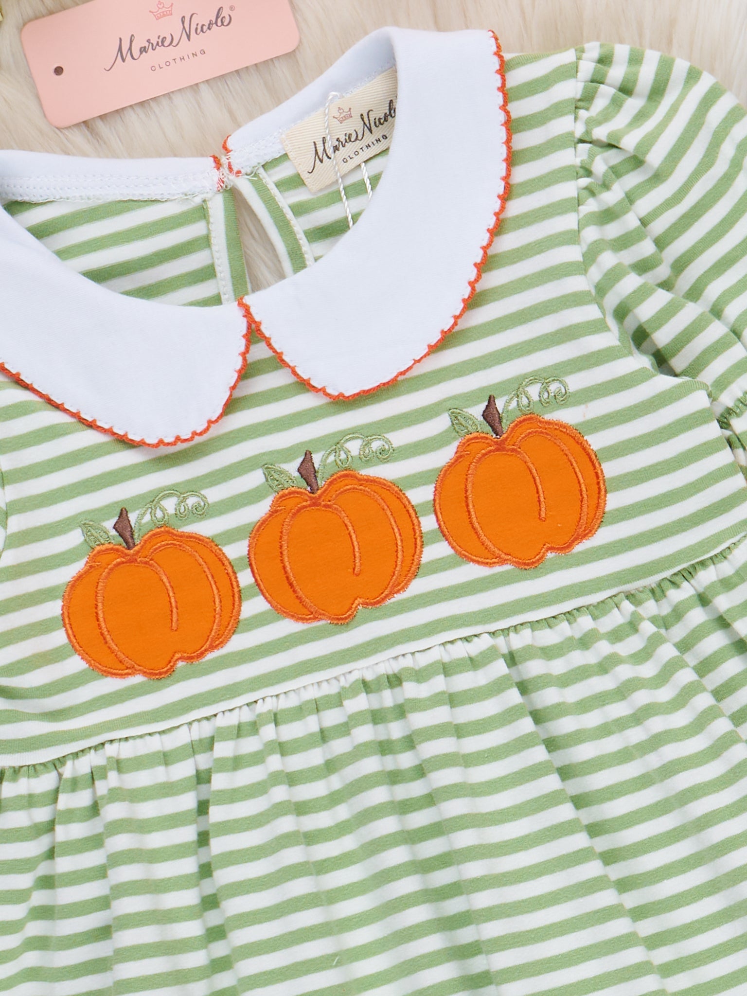 A fabulous sister set for your girls who love pumpkin season! This dress features green and white stripes with an embroidered pumpkin design, a white Peter pan collar, and ruffle trim on the sleeves.