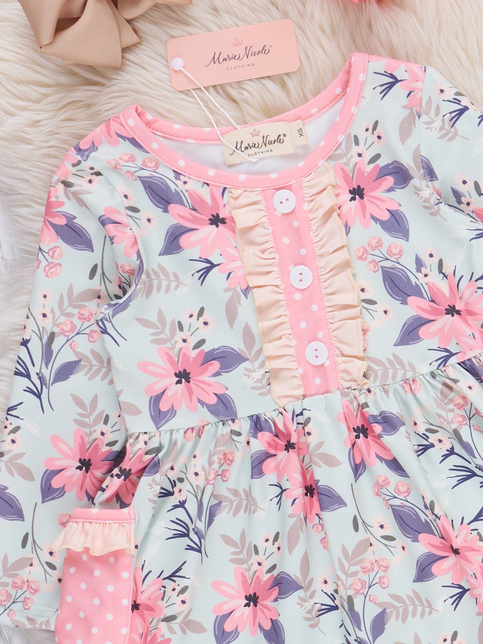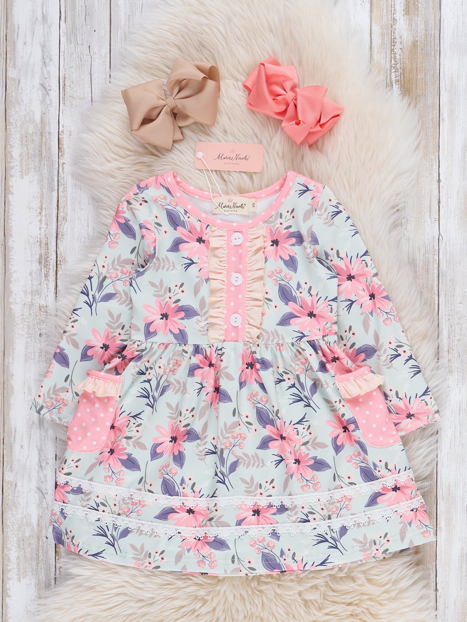 The Pinky Blooms Dress by Marie Nicole features a charming floral print on a classic long-sleeve, gathered silhouette. With a decorative button placket, contrasting patch pockets, and delicate trims at the collar and waist, this dress pairs comfort with a touch of whimsy.