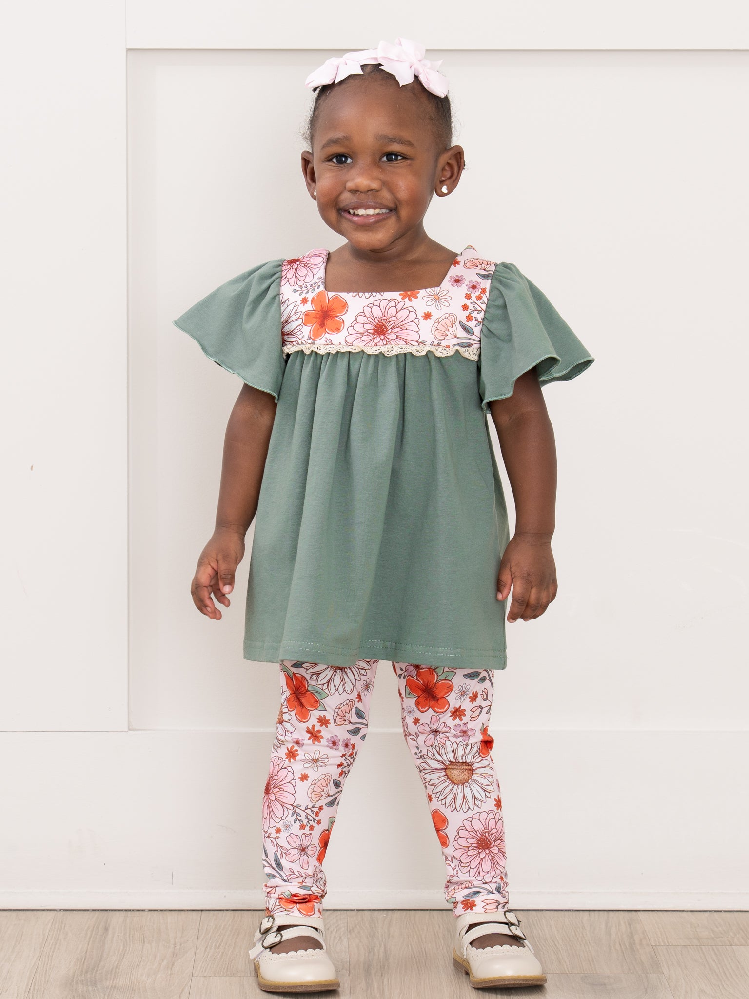 Kids will love the Poppy Meadow Ruffle Outfit! This girls' set features a stylish olive green swing top with delicate lace trim and fun floral leggings. This two-piece outfit is a blooming good time.
