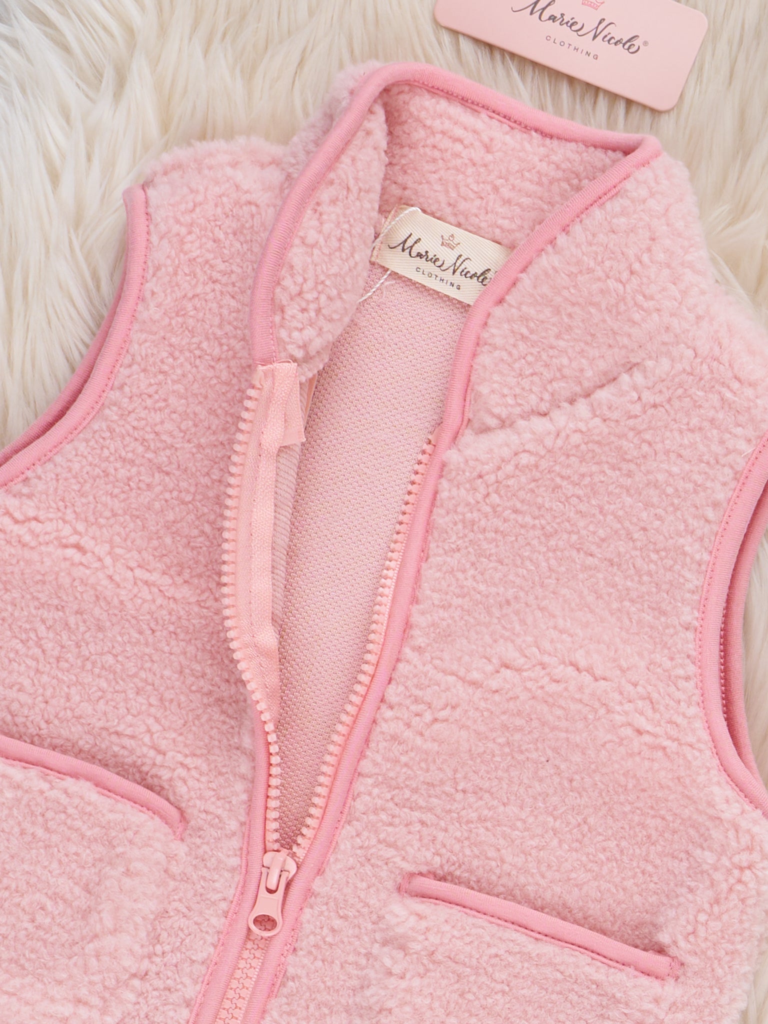 The Cotton Candy Vest by Marie Nicole features a soft, plush texture like cotton candy, with a cozy stand-up collar, two front patch pockets, and an easy zip-up closure. Perfect for layering, this sleeveless vest adds a gentle, whimsical touch and everyday comfort.