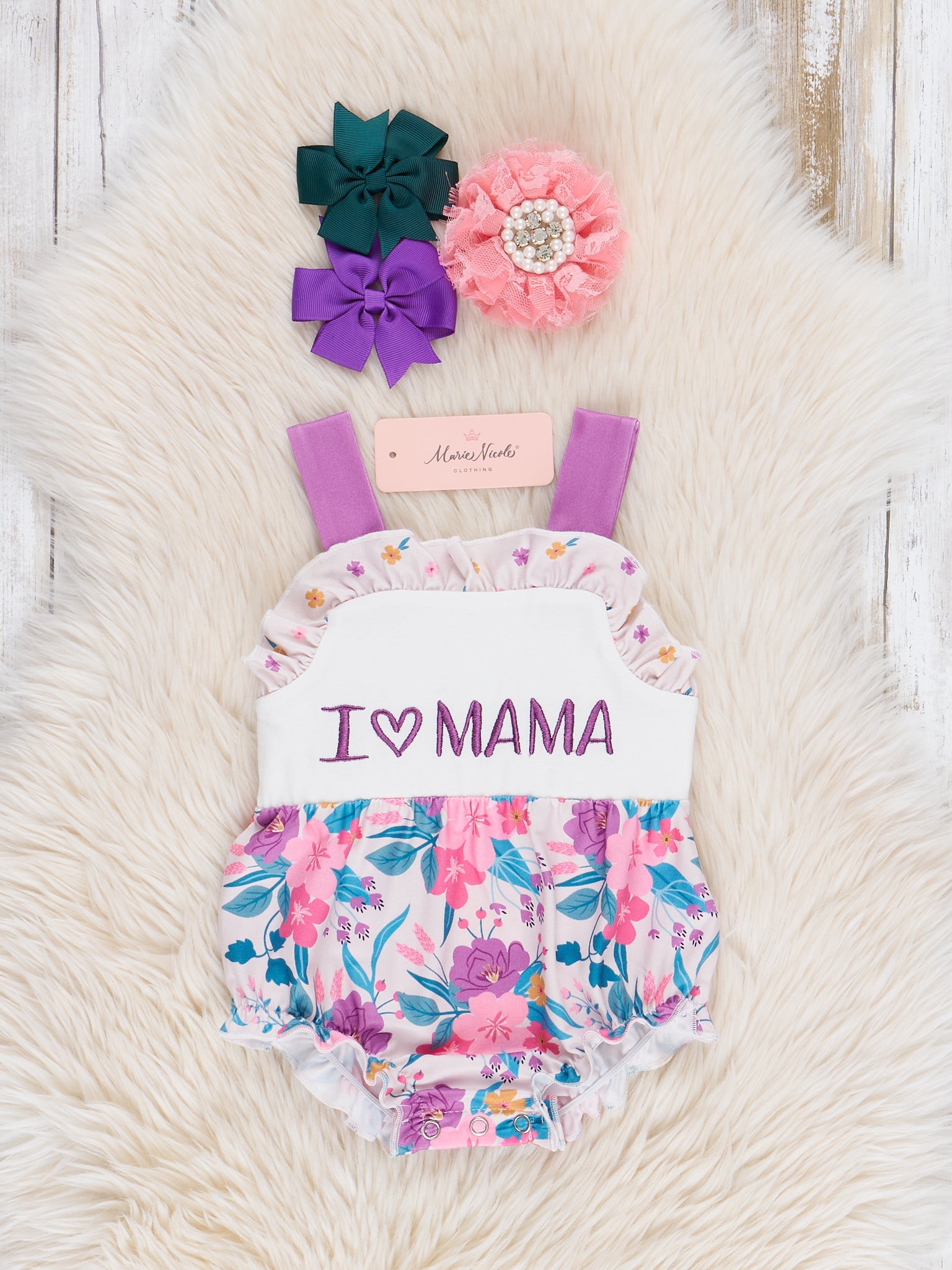 The"I Love Mama" Floral Bubble for your mama's girl! This bubble features gorgeous purple florals, an embroidered "I Love Mama", flutter sleeves, ruffle trim, & adjustable straps. So lovely!