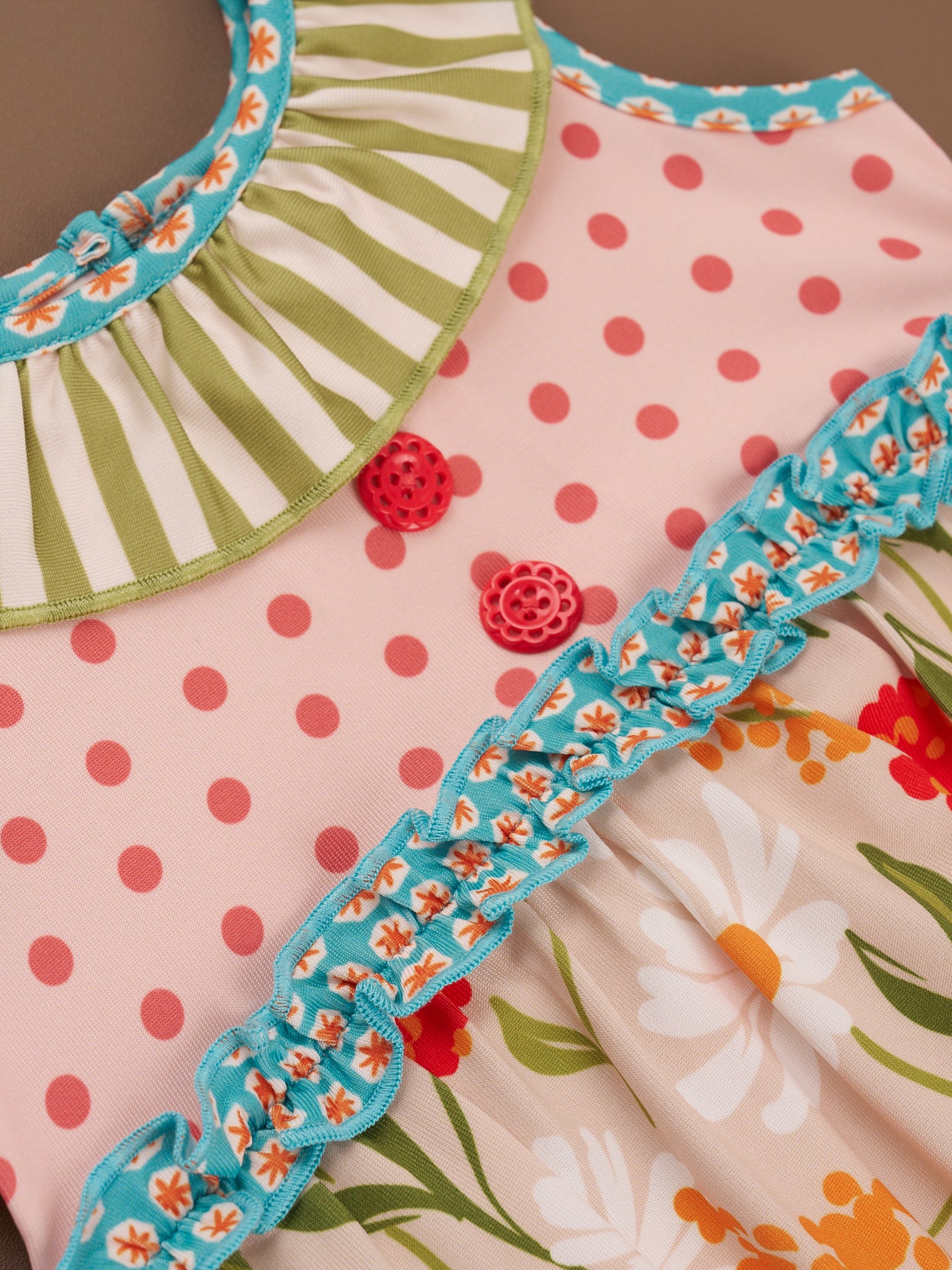 Put a playful spin on your little's spring wardrobe with Daisy Janes Ruffle Infant Gown. This MNC Exclusive Collection piece celebrates the season with vibrant greens, oranges. Plus the striped ruffles & matching headband add a fun twist. Parade around town with confidence and style!