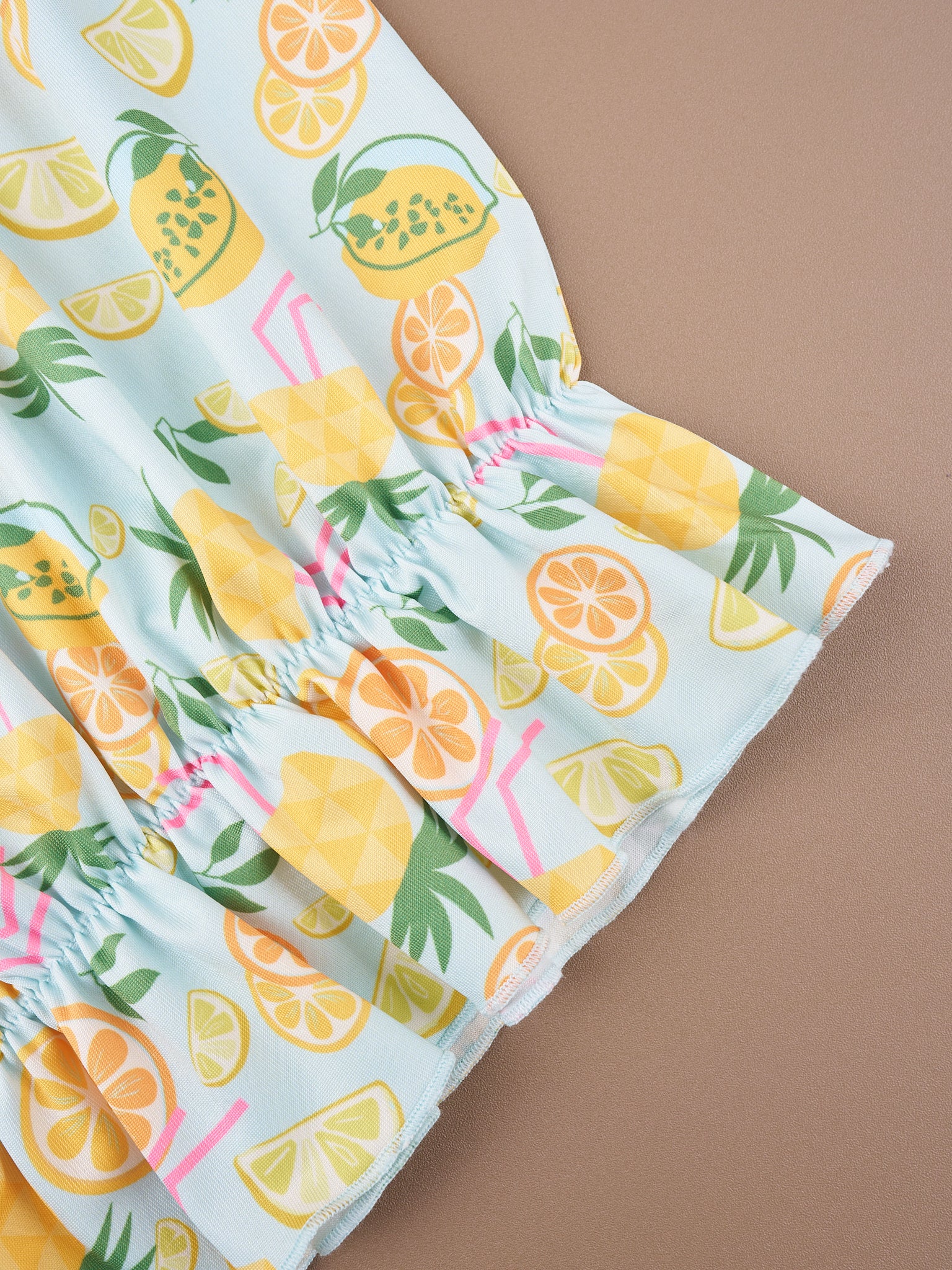 This collection features a stunning, hand-drawn print with a medley of pineapples, lemons, limes, and oranges.