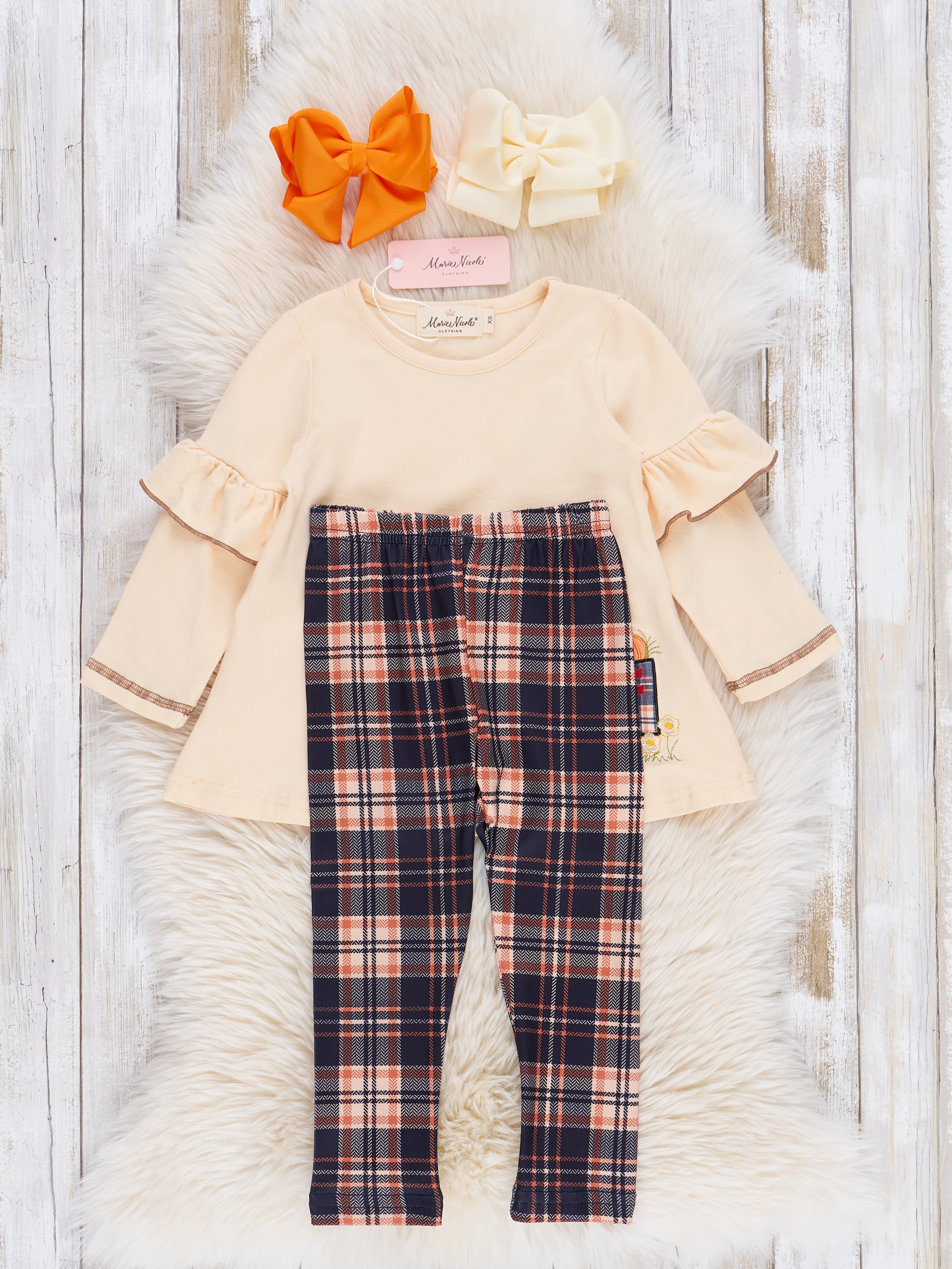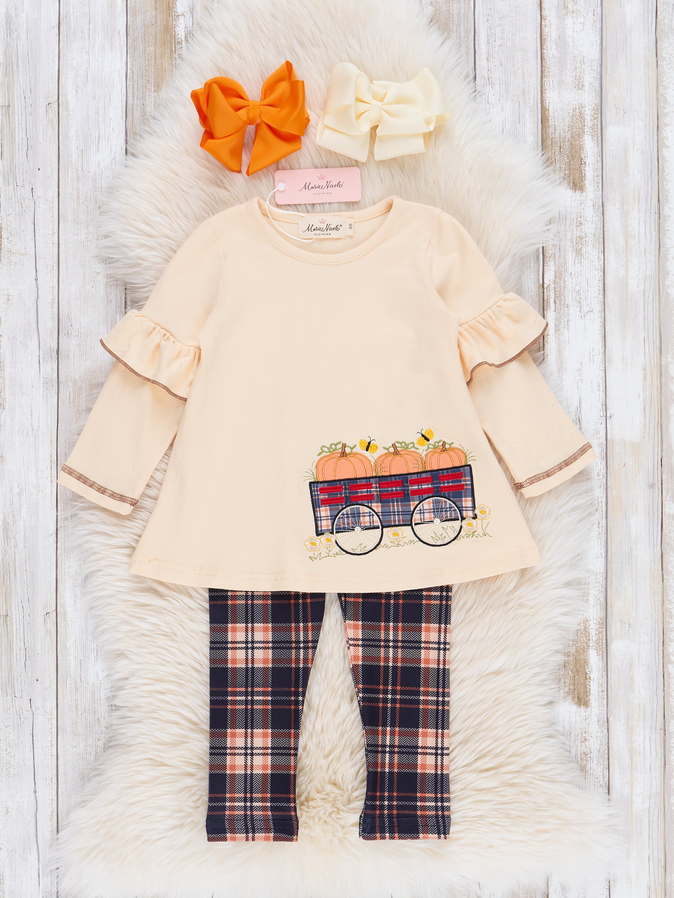 Get your little pumpkin ready for fall with this adorable sister set! Featuring plaid leggings and a brown embroidered wagon with pumpkins, this outfit is perfect for any autumn adventure. Plus, it's the perfect opportunity for some sisterly matching!