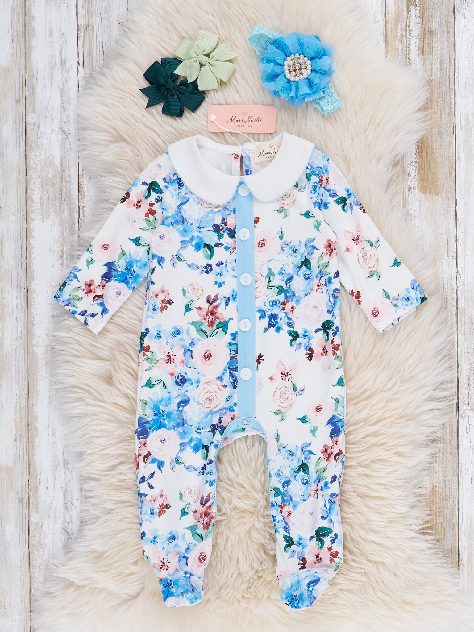 The Garden Breeze Footed Sleeper Pajamas by Marie Nicole Clothing feature a soft floral design with a delicate collar, cozy footed bottoms, and gentle fabric for restful sleep. These pajamas are designed to provide all-night comfort and easy changing, making them perfect for everyday wear or special occasions in a nature-inspired style.