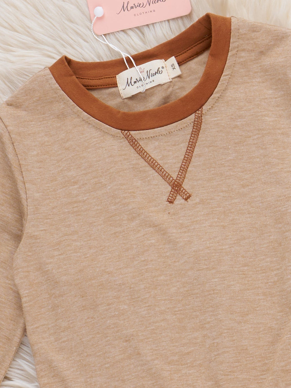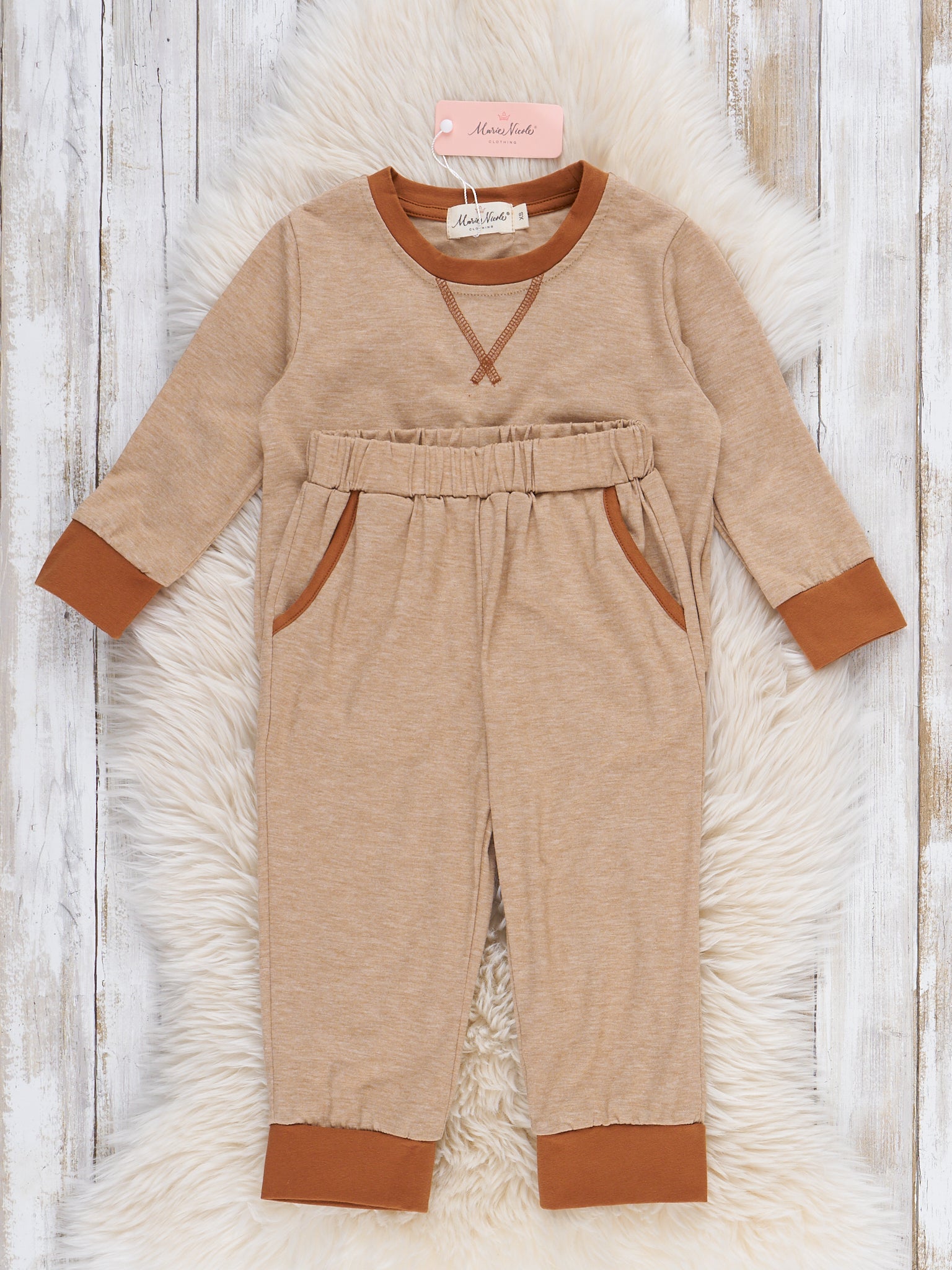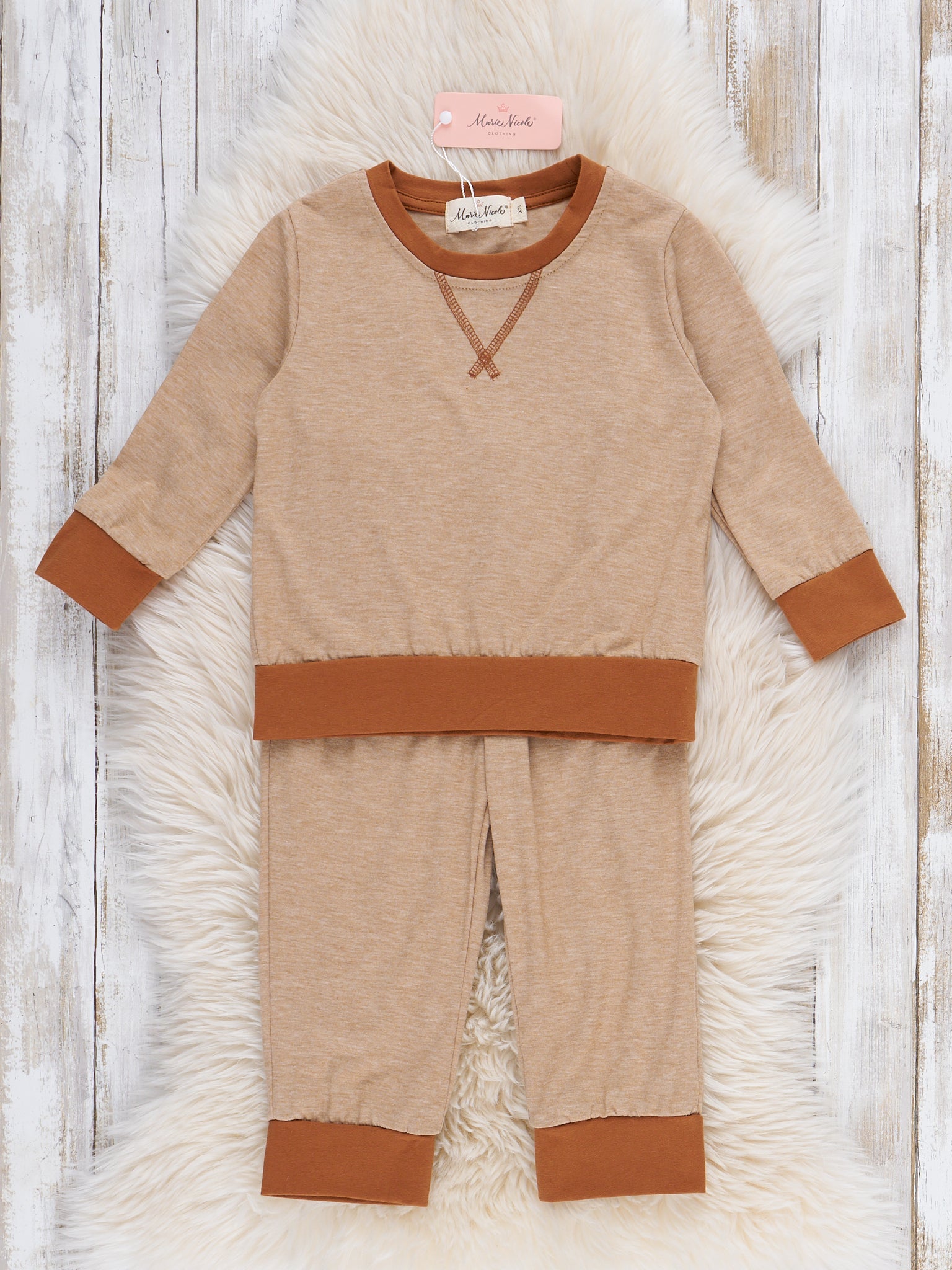 The Hot Cocoa Jogger Pajamas by Marie Nicole Clothing includes a long-sleeve top with ribbed cuffs and matching jogger-style pants featuring contrast pocket and ankle trim. This two-piece lounge set is designed for cozy comfort and casual style, making it perfect for relaxing mornings and restful evenings and sipping on a hot chocolate!