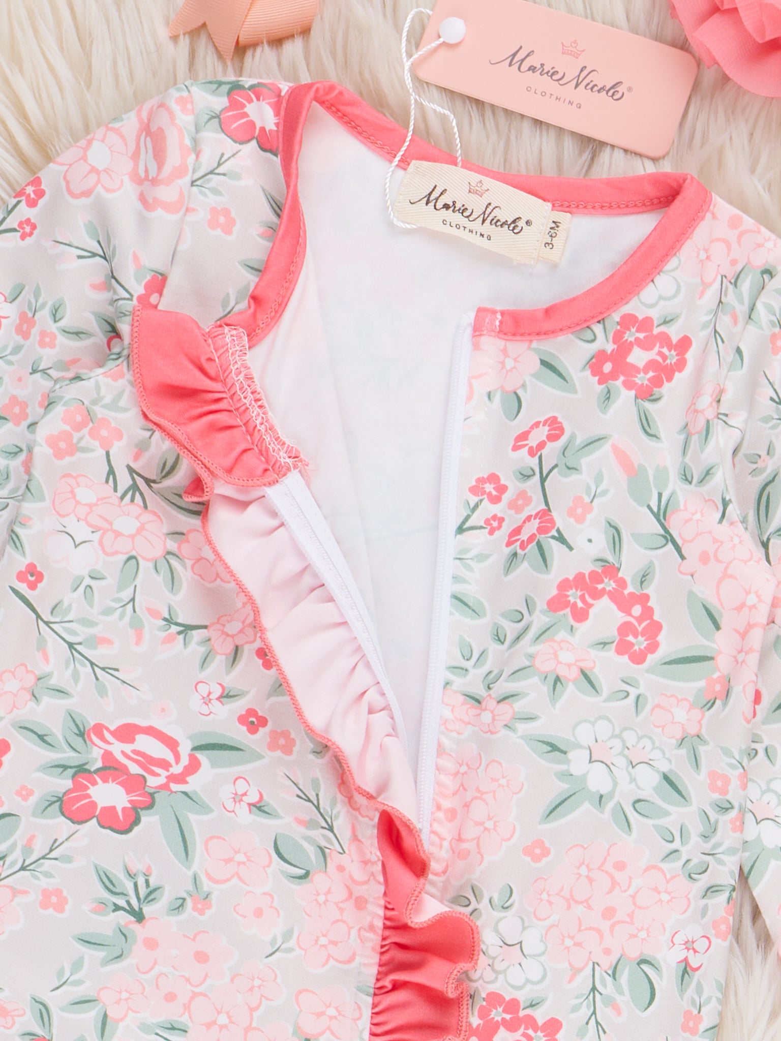 The Rosebud Ruffle Footed Sleeper Pajama by Marie Nicole Clothing features a delicate floral print and a playful ruffle trim down the front. With cozy footed bottoms and soft, stretchy fabric, this zipper pajama is designed for gentle comfort and sweet style for little ones.