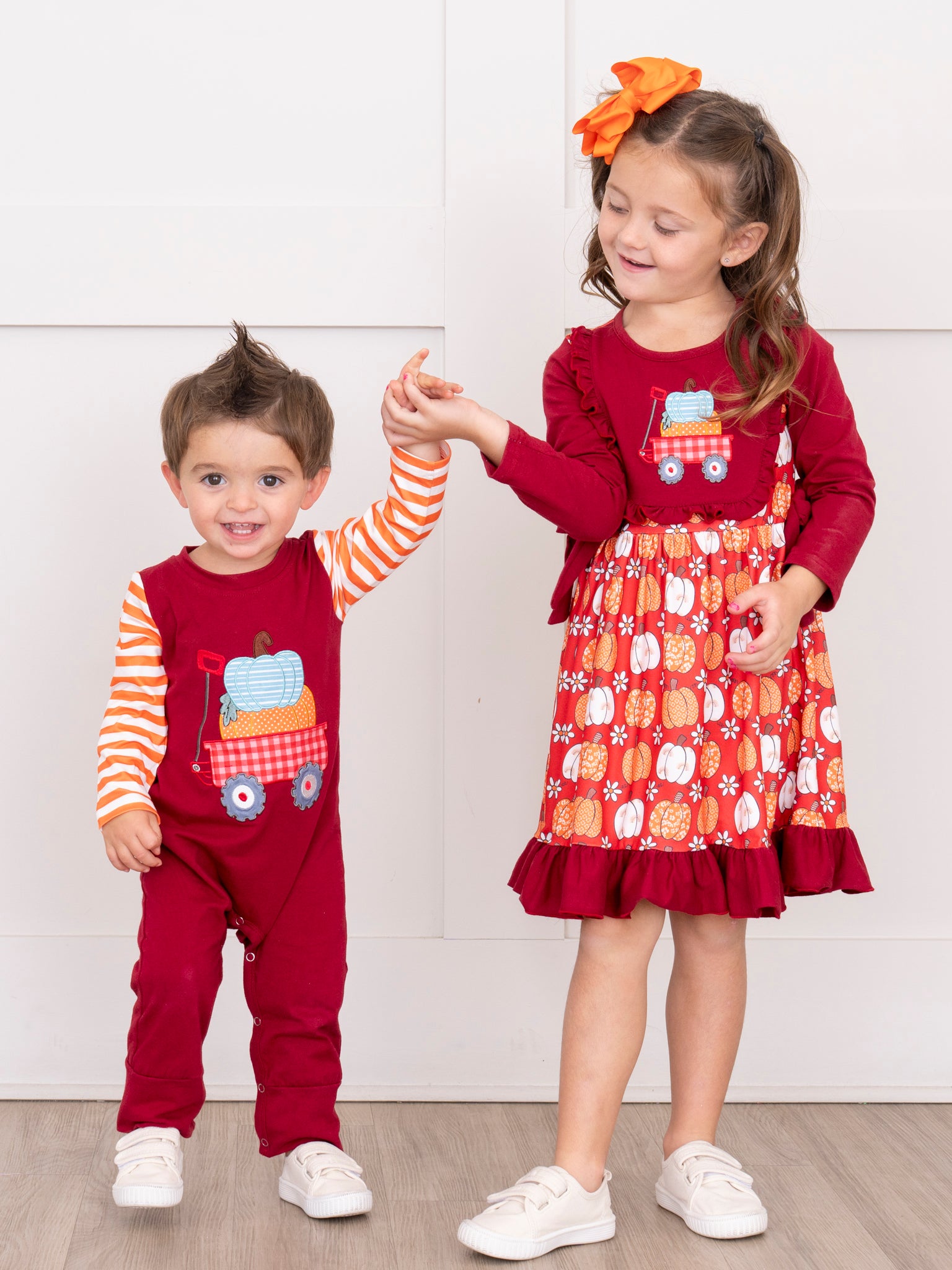 Pumpkins and pumpkins! The Maroon Pumpkin Wagon Embroidered Striped Romper by Marie Nicole Clothing brings autumn cheer for the little ones with embroidery and stripes. The fun pattern and soft fabrics will keep your little one stylish, expressive, and comfy this fall season!
