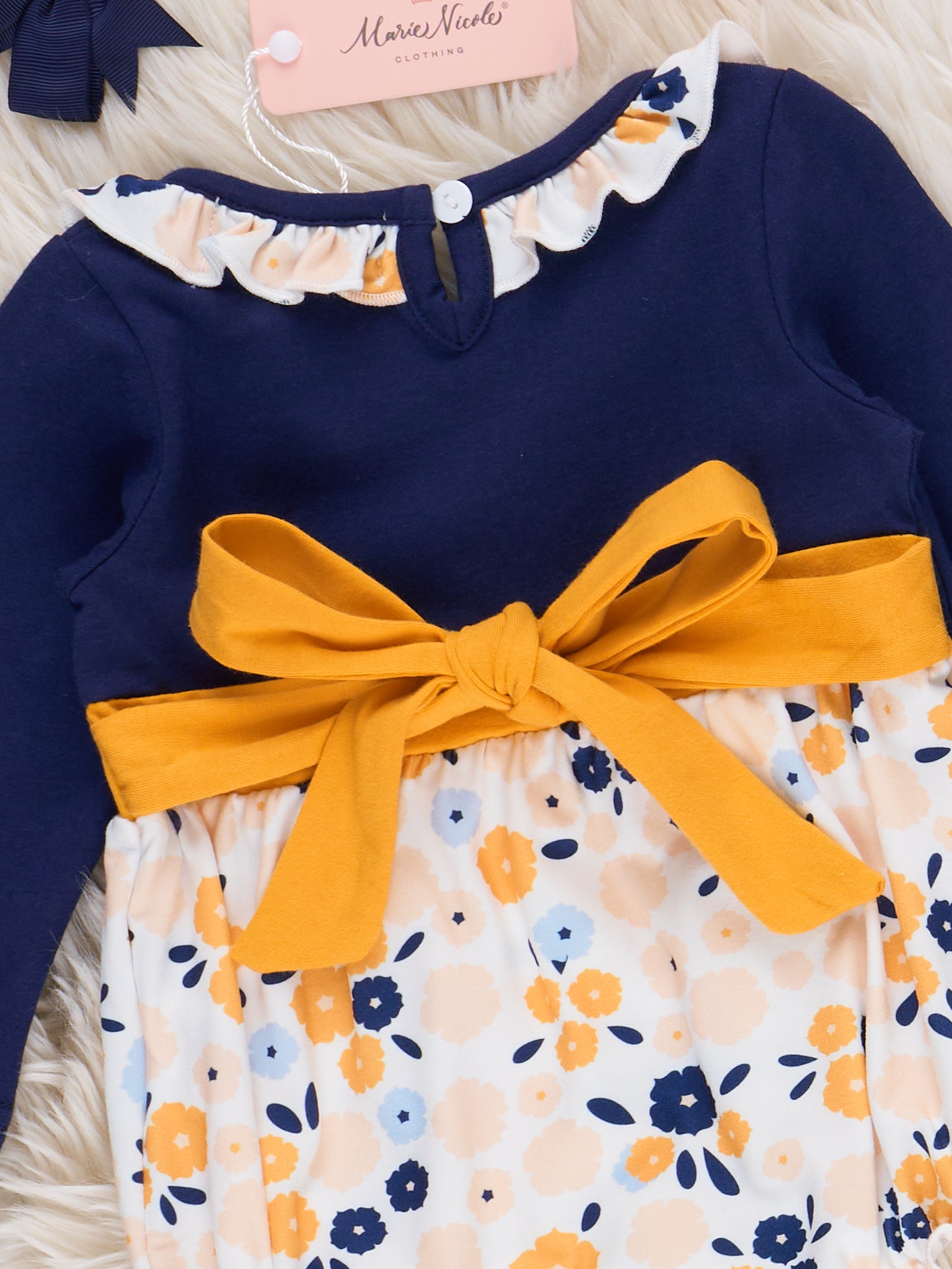 The Midnight Blooms Ruffle Bubble by Marie Nicole features a contrasting long-sleeve bodice with a playful ruffle collar and a gathered bubble bottom adorned with a delightful floral print. Completing the look are sweet pocket details and a comfy elasticized waist and leg openings.