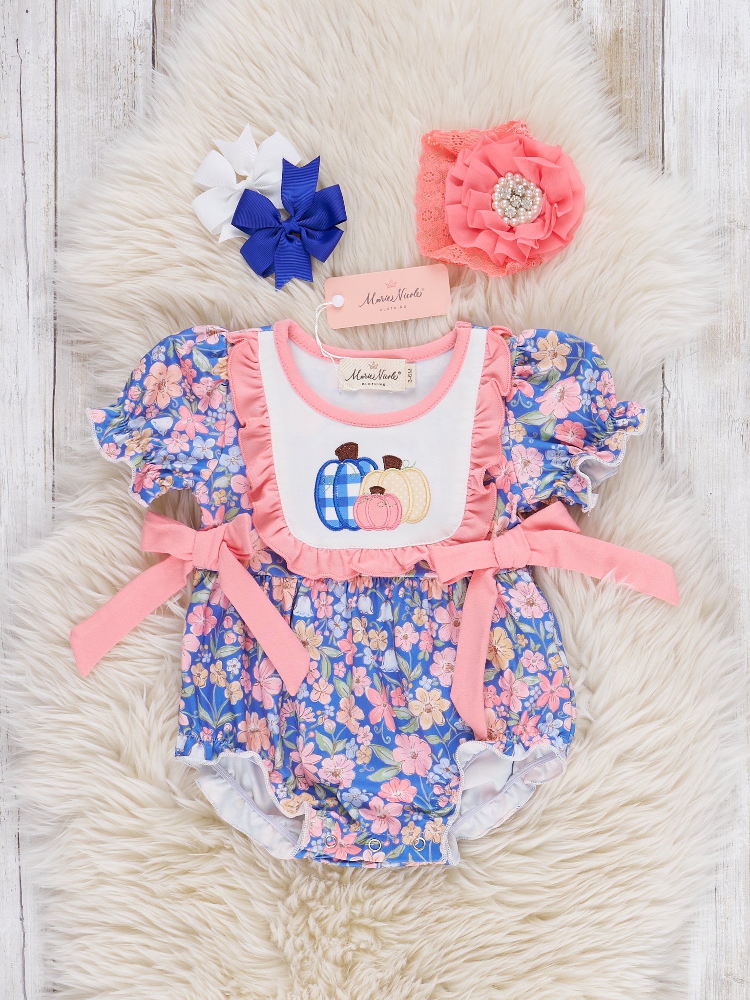 A harvest full of pumpkins and flowers! The Pumpkin Botanicals Embroidered Bow Bubble Romper is a celebration of floral fall beauty. With bow and ruffle embellishments, soft fabric, and pumpkin embroidery, this pretty one-piece by Marie Nicole Clothing is sure to charm. Your little girl will love wearing this during autumn gatherings and nice occasions!