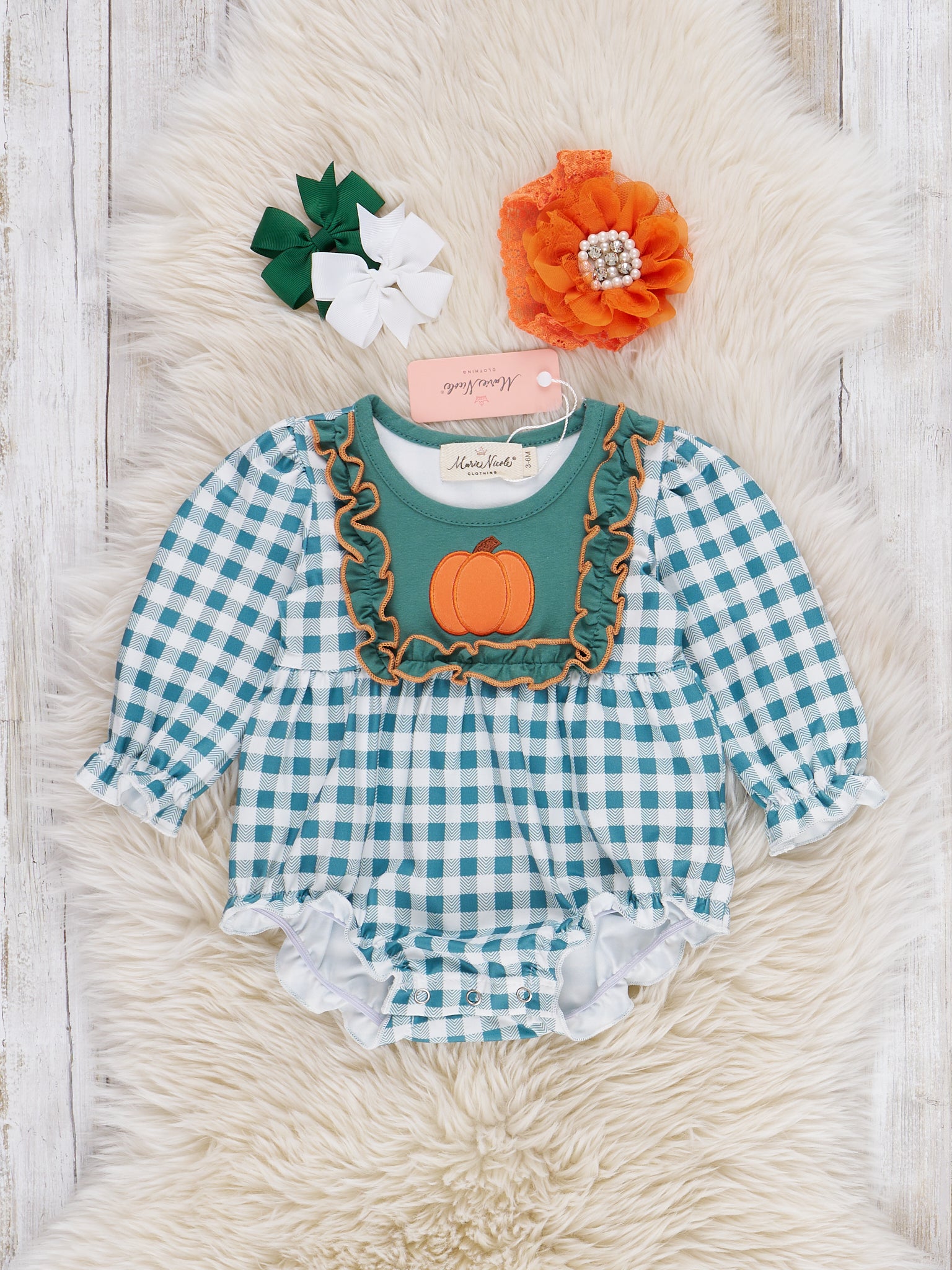 The Pumpkin Patch Pines Embroidered Plaid Bubble Romper is a classic piece full of fall charm. This one-piece by Marie Nicole Clothing features ruffles, gingham, and embroidered pumpkin. Made with soft fabric, this romper is a lovely for any autumn activities and Thanksgiving gatherings!