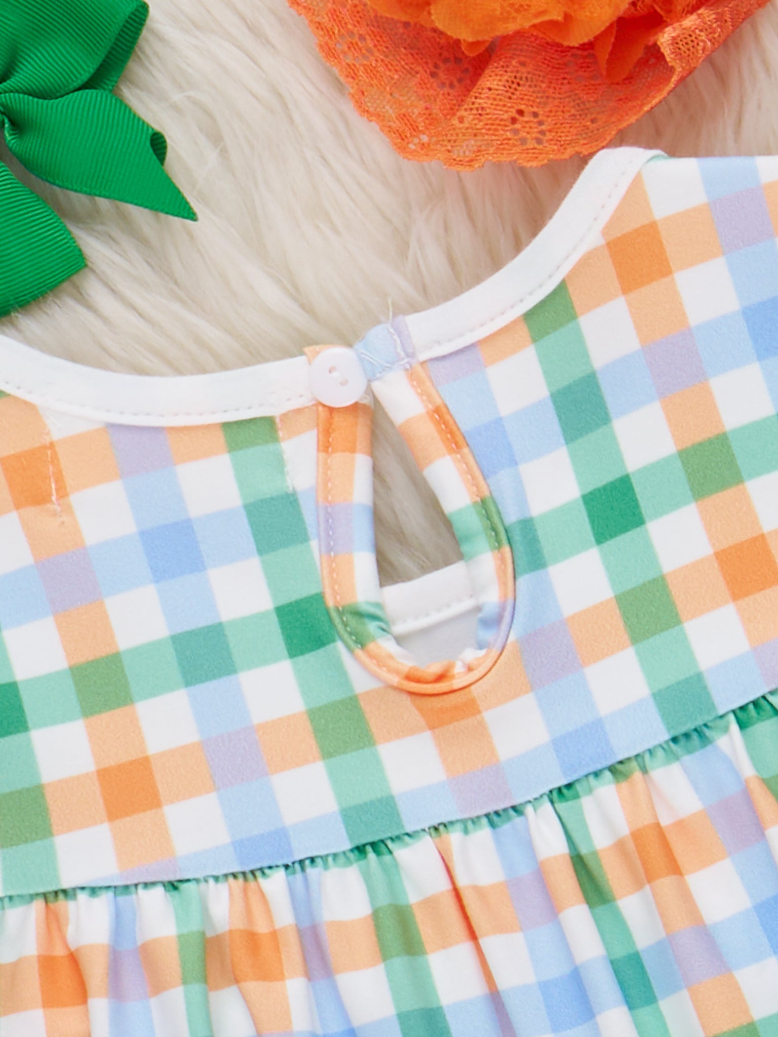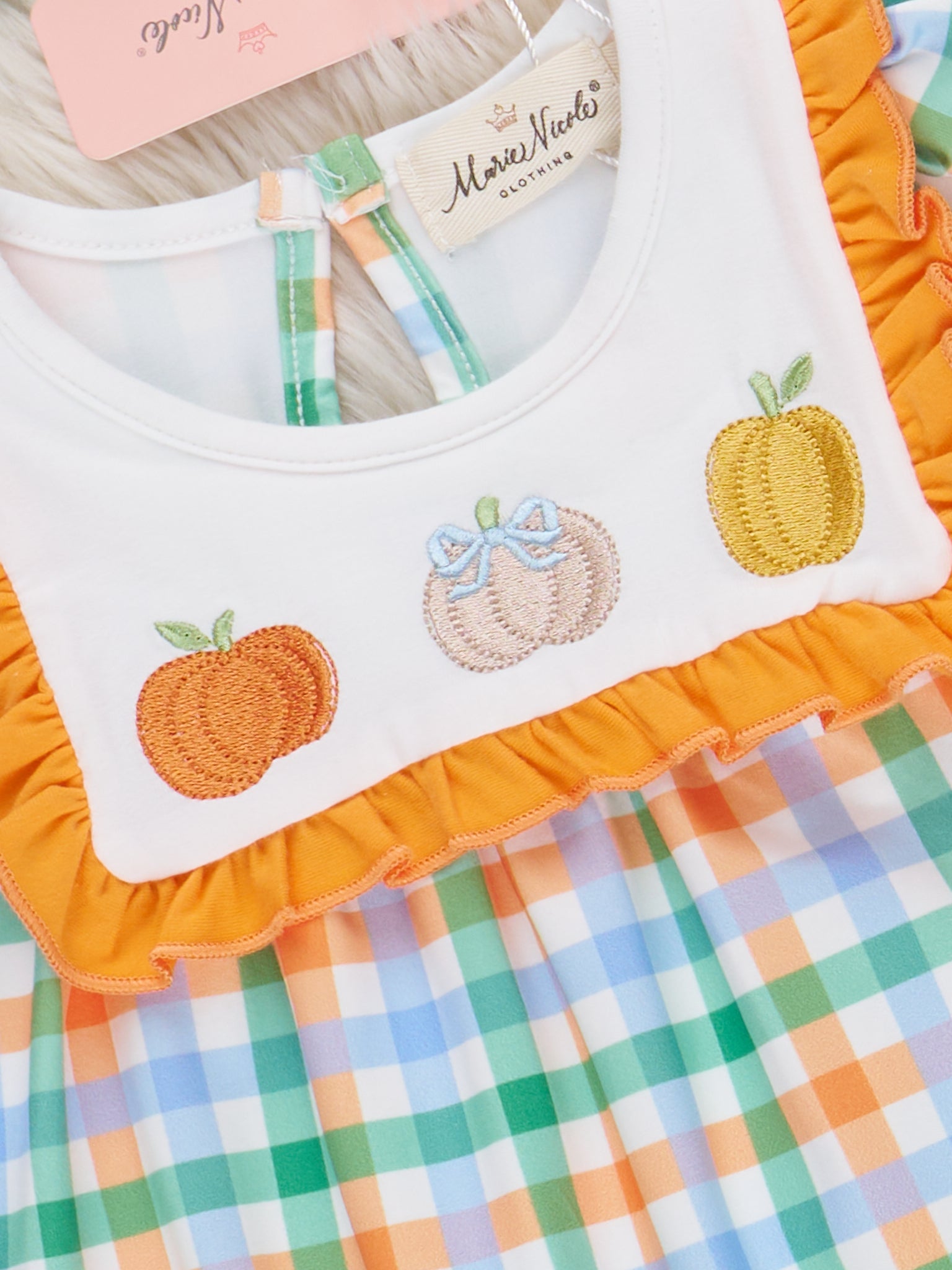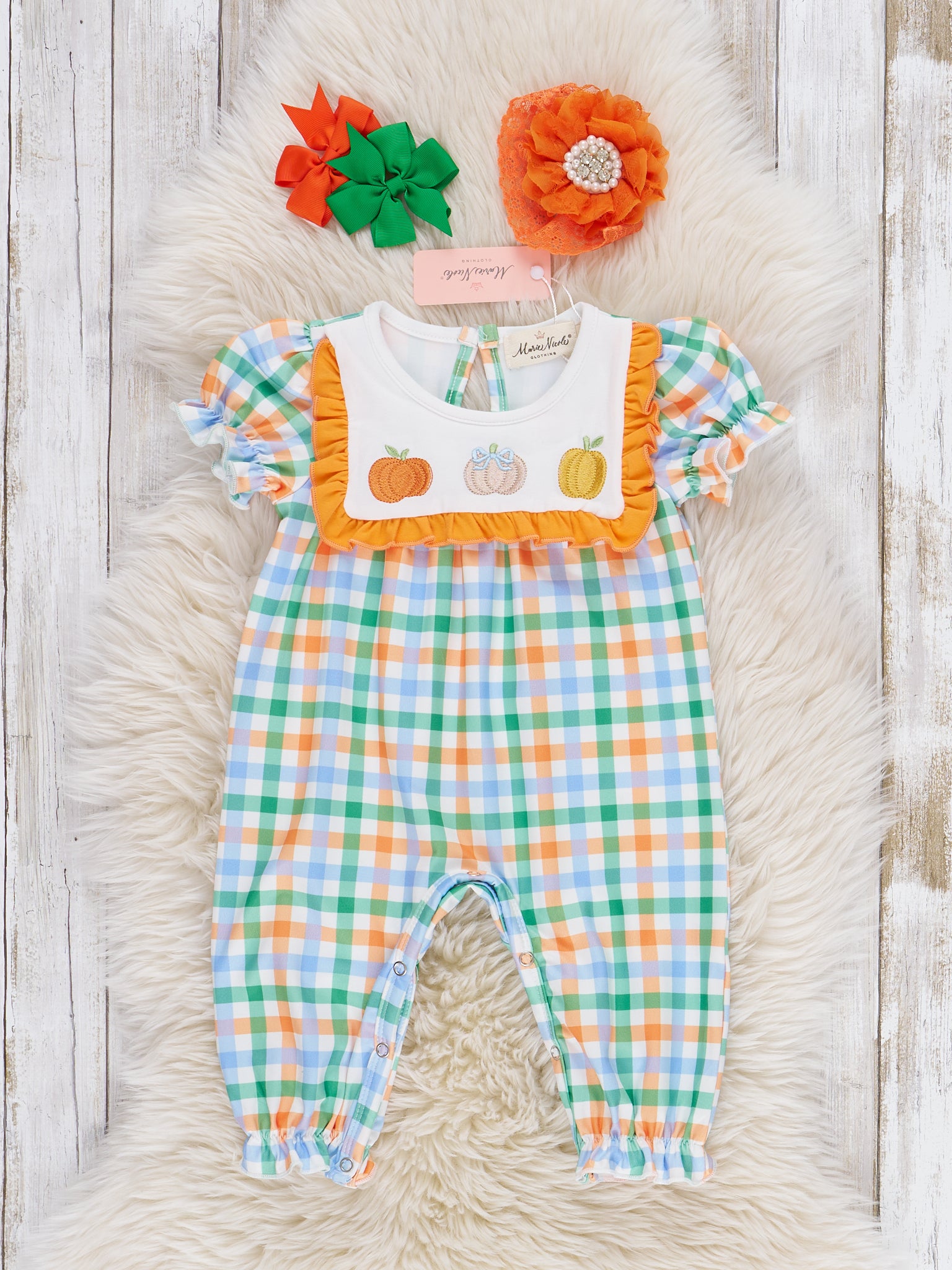 Colorful in plaid! The Pumpkin Playtime Embroidered Plaid Romper by Marie Nicole Clothing is made for fun. This cute one-piece features an adorably embroidered bib collar. With soft and stretchy material, it is comfy for the fall months, great whether your little girl is running down the pumpkin patch or settling down for a Thanksgiving feast!