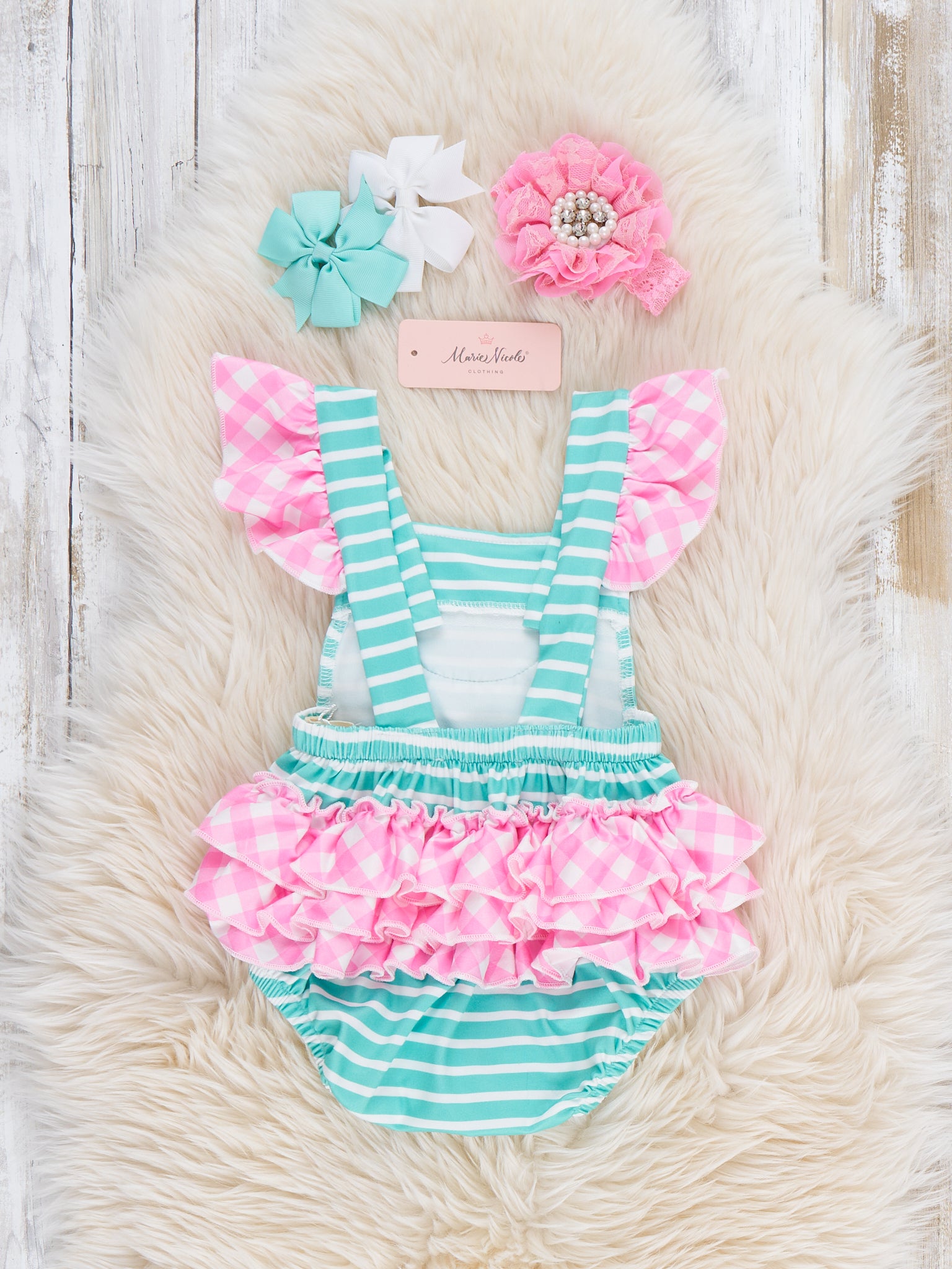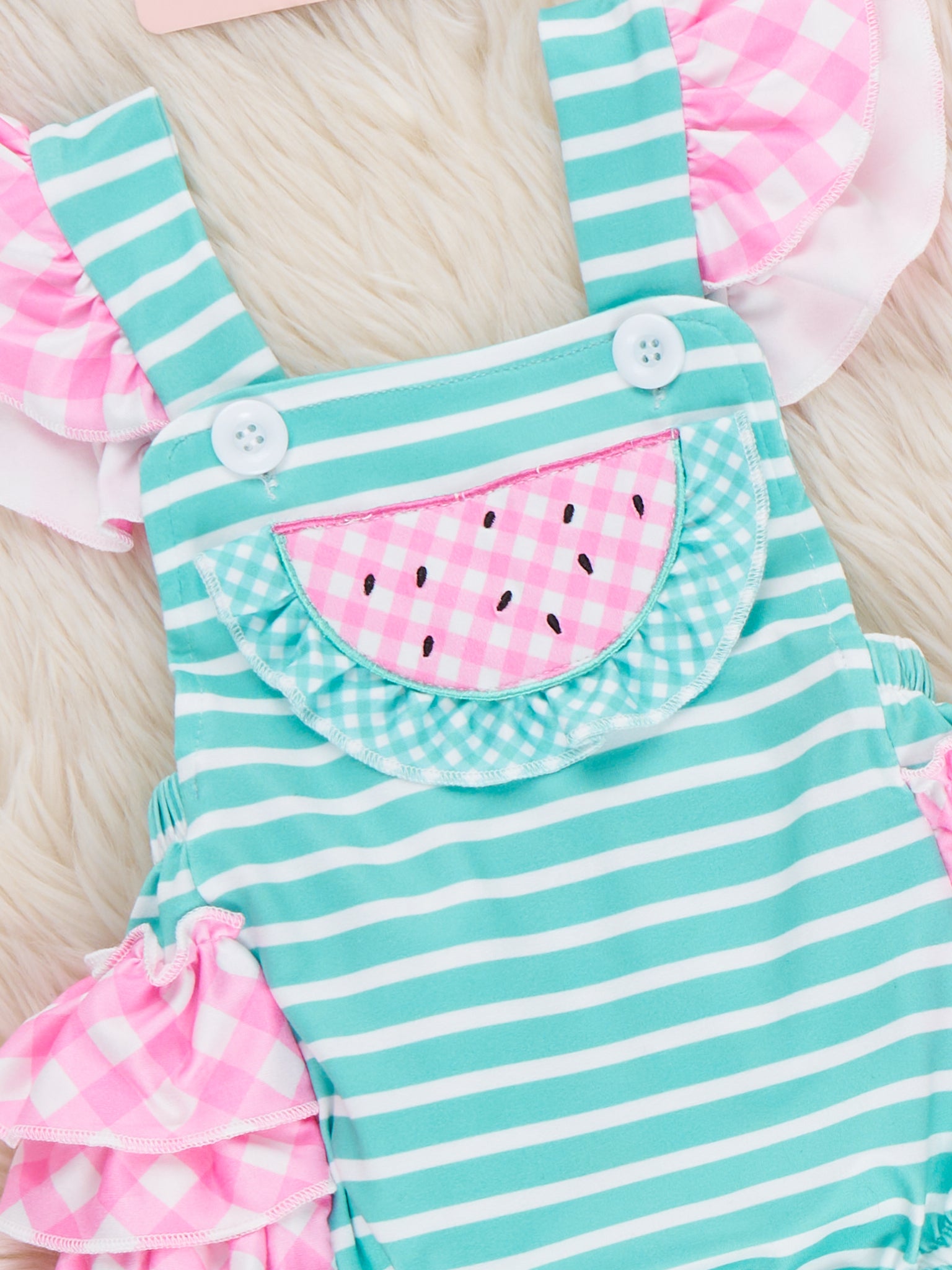 Gear up your little girl for summer with this adorable Watermelon Gingham Ruffle Bubble by Marie Nicole Clothing. The bubble in this sister set includes a striped bodice bearing an embroidered watermelon detail and gingham ruffle butt for super cuteness. Perfect for picnics, playdates, and more!