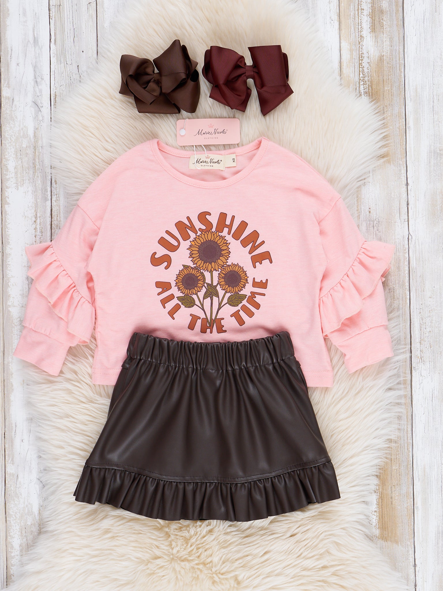 Add some sunshine to your little one's wardrobe with our Pink Sunflowers Outfit! Featuring a playful "Sunshine All the Time" print on a pink ruffle crewneck shirt, paired with a black faux leather skirt. Perfect for adding a touch of sunshine to any occasion. 🌻