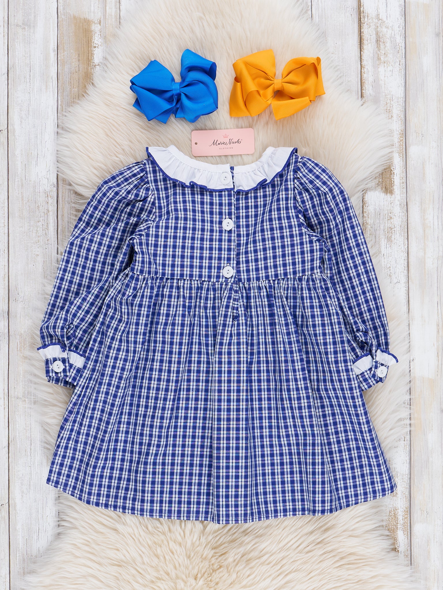 Be the sunshine this autumn with our Blue Gingham Smocked Sunflowers Dress! Perfect for girls who love to play and twirl, this dress features charming embroidered sunflowers over smocking. With a playful ruffle collar and a print inspired by sunflower fields, this dress is sure to bring a smile to your little one's face.
