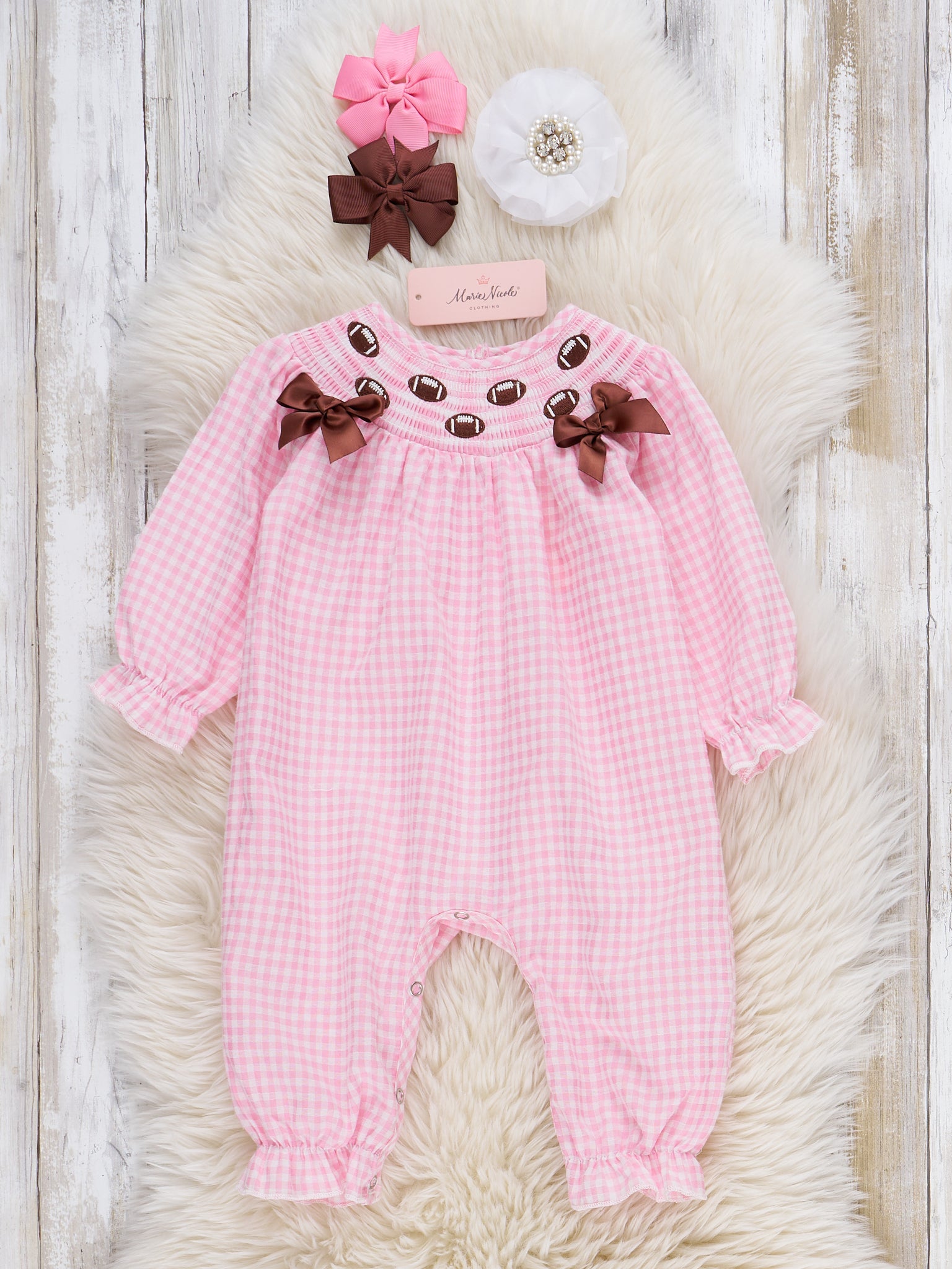 Game day wouldn't be complete without this dress! The Game Day Gingham Smocked Embroidered Dress is an adorable piece by Marie Nicole Clothing, featuring embroidered footballs along the collar and a pair of ribbon bows. With soft, flowy gingham fabric, this dress is so comfy that your little girl won't want to wear anything else, whether they play or rest.