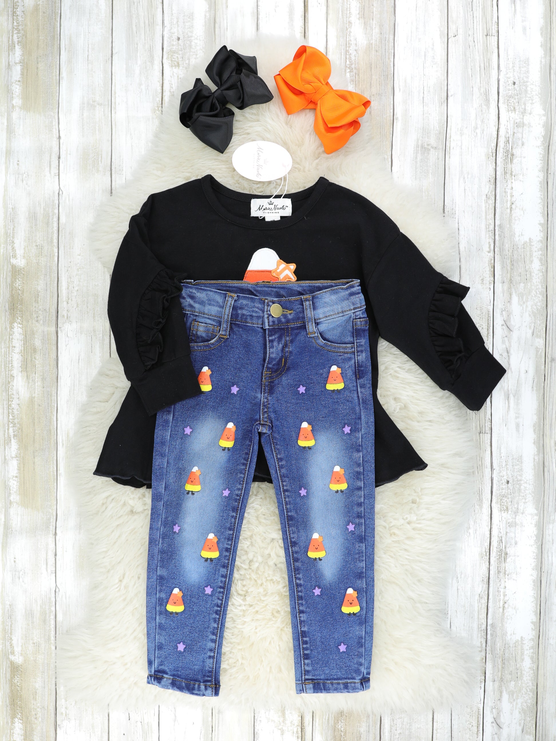 Orange Ghost Peplum Top & Pumpkin Candy Corn Bottoms Outfit W/ Scarf
