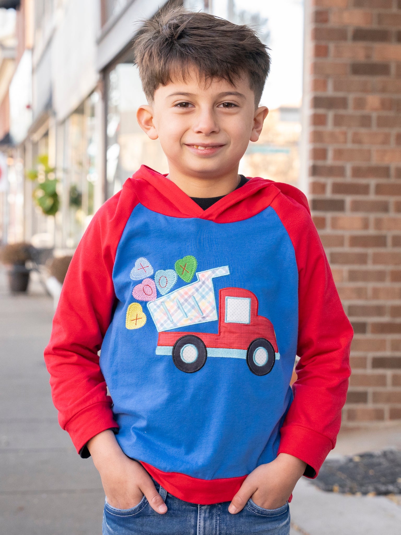 Show your love in style with this sweet brother set! A blue bodice with red raglan sleeves, a hood, and a candy hearts dump truck embroidered on the front makes this hoodie an adorable outfit for any Valentine's adventure. Spread the love!