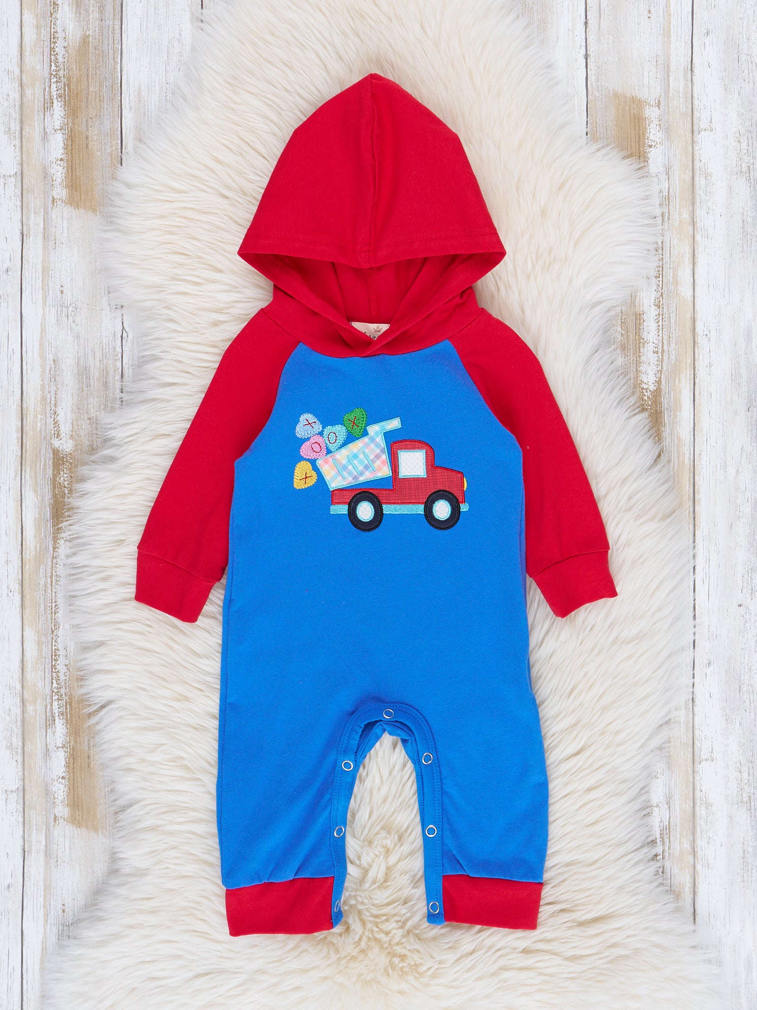 Show your love in style with this sweet brother set! A blue bodice with red raglan sleeves, a hood, and a candy hearts dump truck embroidered on the front makes this romper an adorable outfit for any Valentine's adventure. Spread the love!